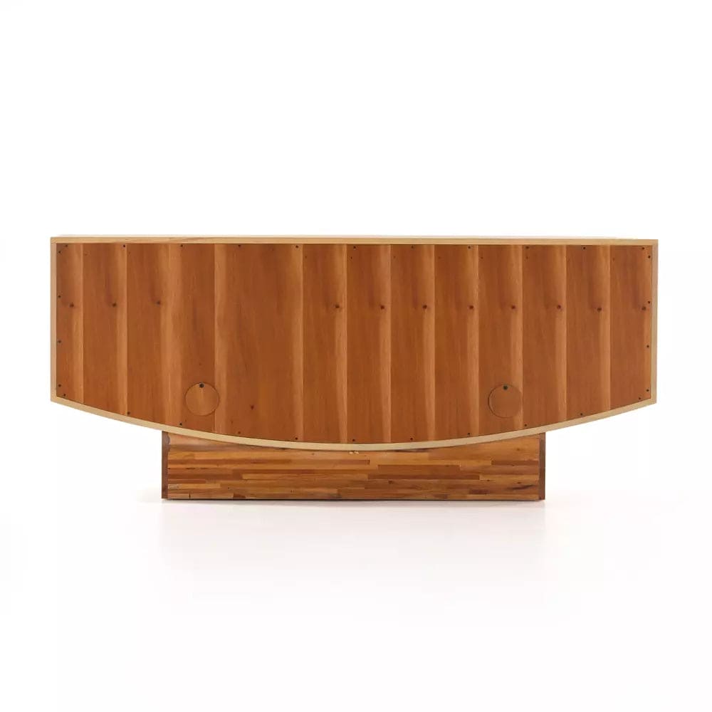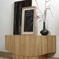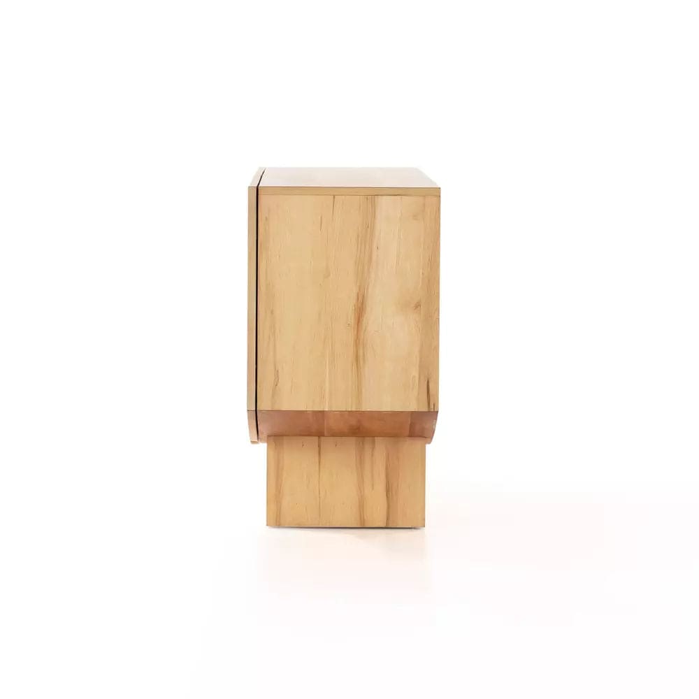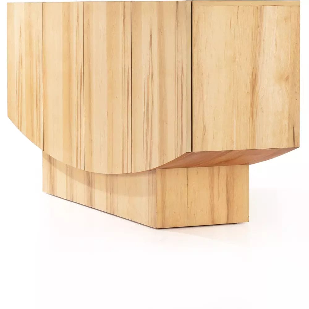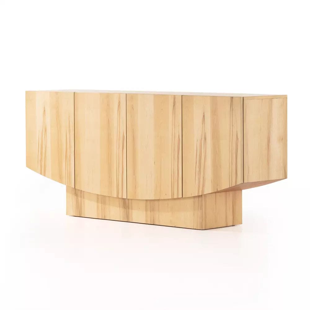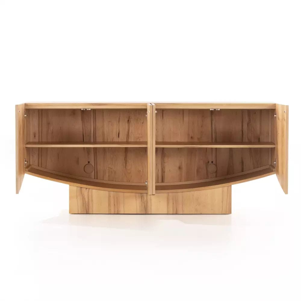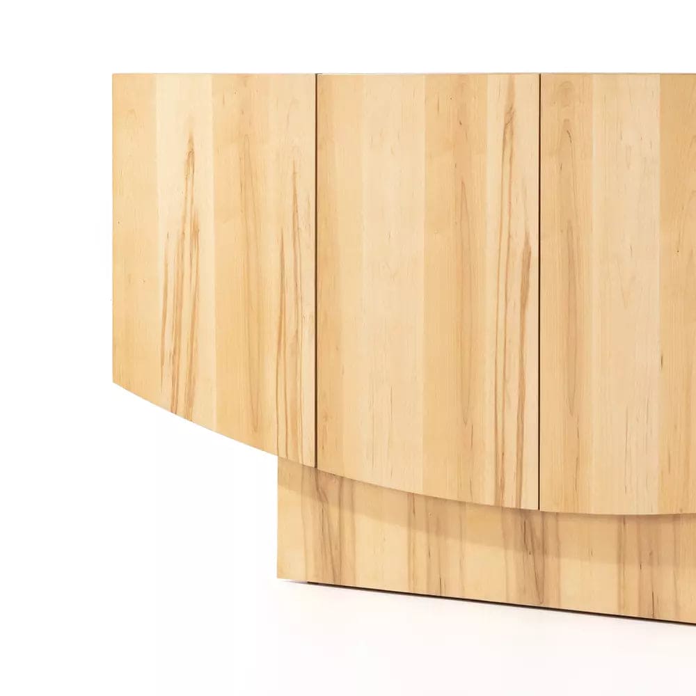 A shapely take on a monolithic form. Made from light maple veneer, a spacious sideboard features a variegated finish for a linear look, with generous interior storage plus rear cutouts for cord management.