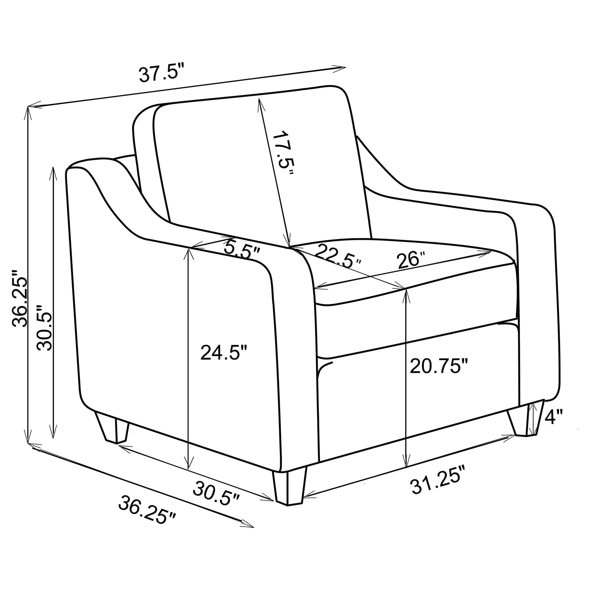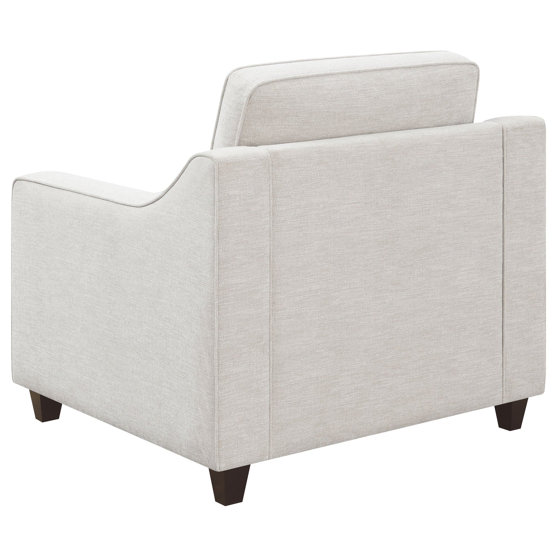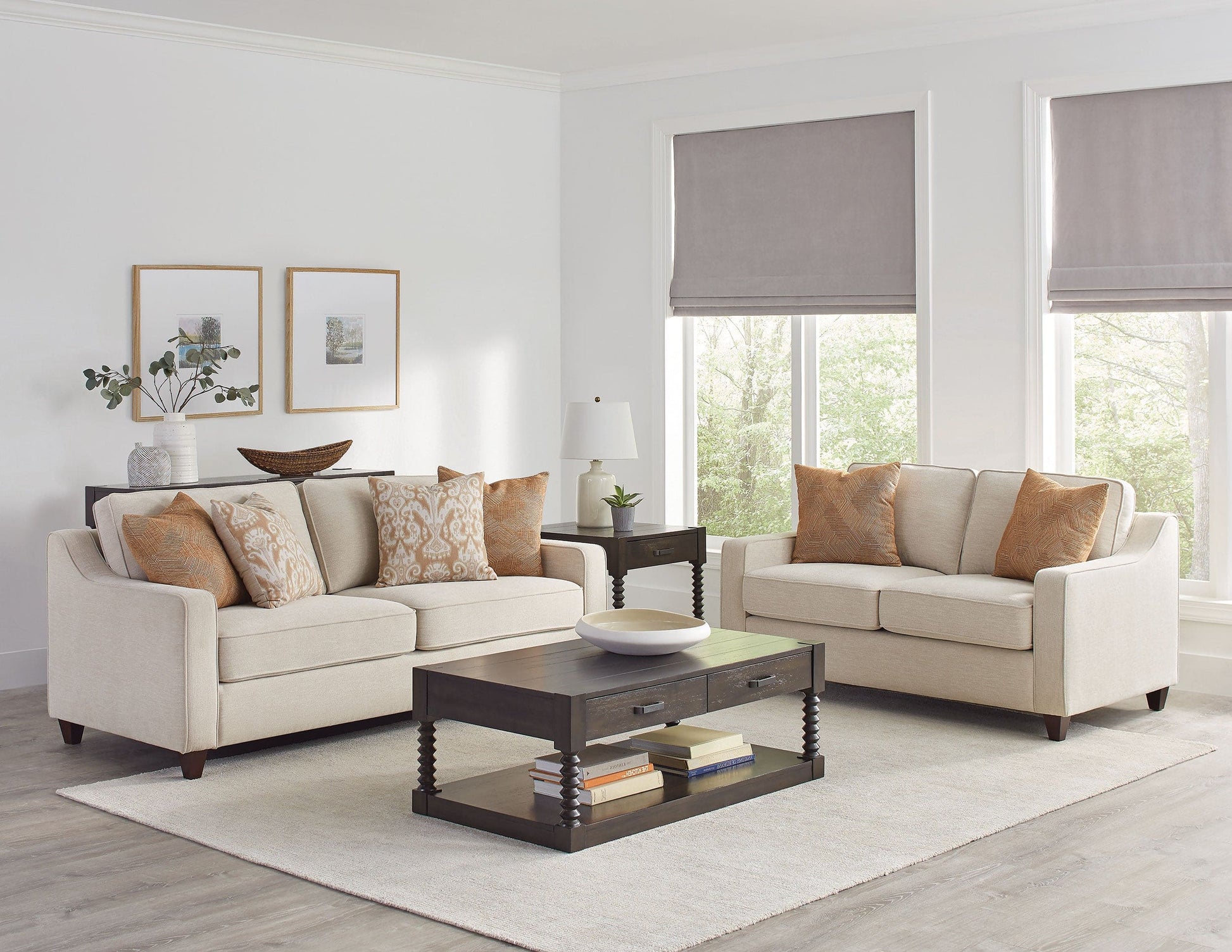 Wrapped in a cheerful, beige woven chenille upholstery, this seating set exudes a look of sophistication. Sloped track arms add elegant lines while tapered dark brown legs add a striking contrast. Understated yet regal, this transitional seating set works inside farmhouse and contemporary style homes effortlessly. Dense and plush boxed seat and back cushions feature classic welt details, as coral and copper tone accent pillows lend a boho-like tough. Add this upholstered furniture set into a space for a subtle chic aesthetic.
