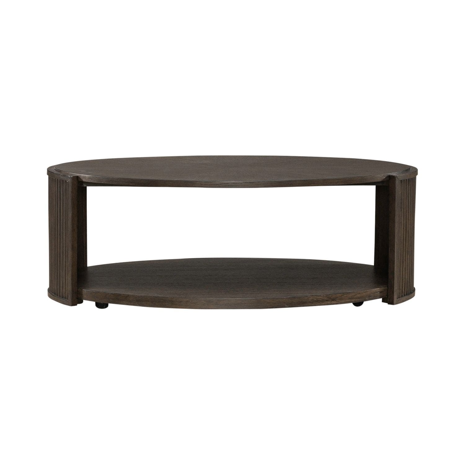With its sleek lines and modern design, the City View oval cocktail table is a statement of impeccable taste and refined sophistication. Crafted with excellence using Rubberwood solids and Quartered White Oak veneers, this table features a Coffee Bean finish. At the heart of this table lies its distinctive oval-shaped top, a testament to its unique design aesthetic. Softly curved reeded end panels frame the top, adding a touch of texture and visual interest while maintaining a sense of understated elegance. But it's not just about looks—the functionality of this cocktail table is equally impressive. An open bottom shelf provides ample space for storage and display, allowing you to showcase your favorite books, decorative items, or personal treasures with ease. And for added convenience, casters ensure easy mobility whenever needed, allowing you to effortlessly move the table to accommodate your changing needs or preferences. Whether you're entertaining guests or simply rearranging your living space, this table makes it easy to create the perfect layout every time. With its blend of contemporary styling and thoughtful features, the City View oval cocktail table is more than just a piece of furniture—it's a reflection of your unique sense of style and impeccable taste. Whether gracing your living room, den, or entertainment area, it promises to elevate any space with its timeless elegance and undeniable charm.