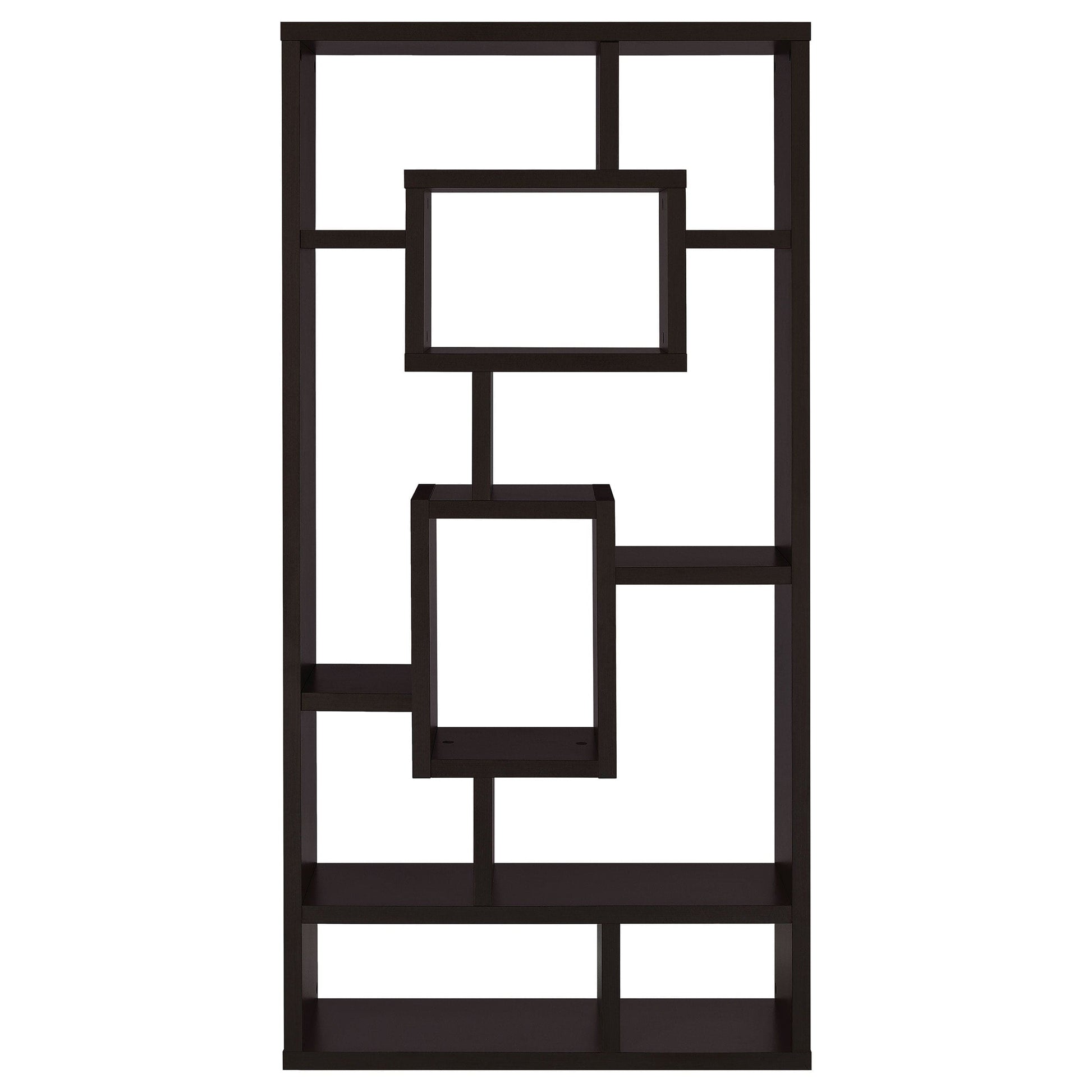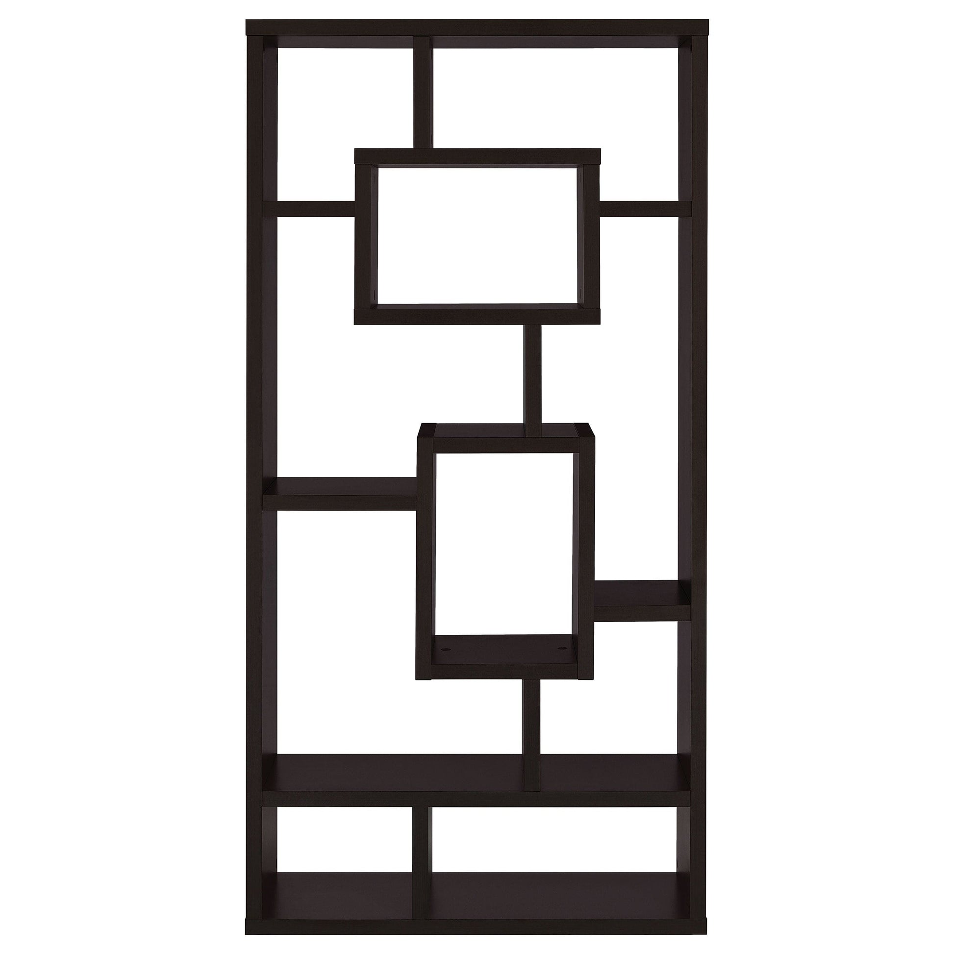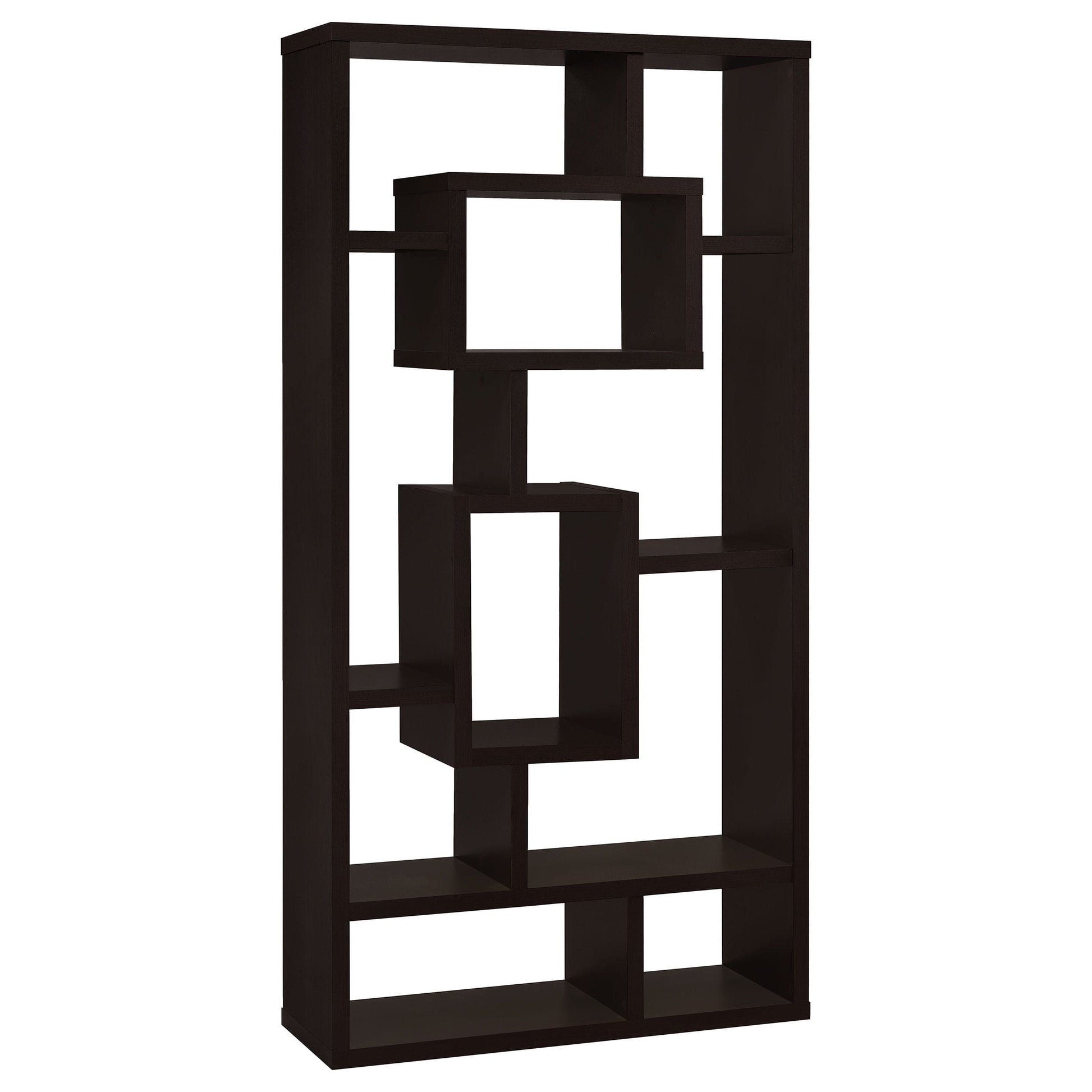 • Cappuccino ten-shelf bookcase with irregular cubed layout for visual interest