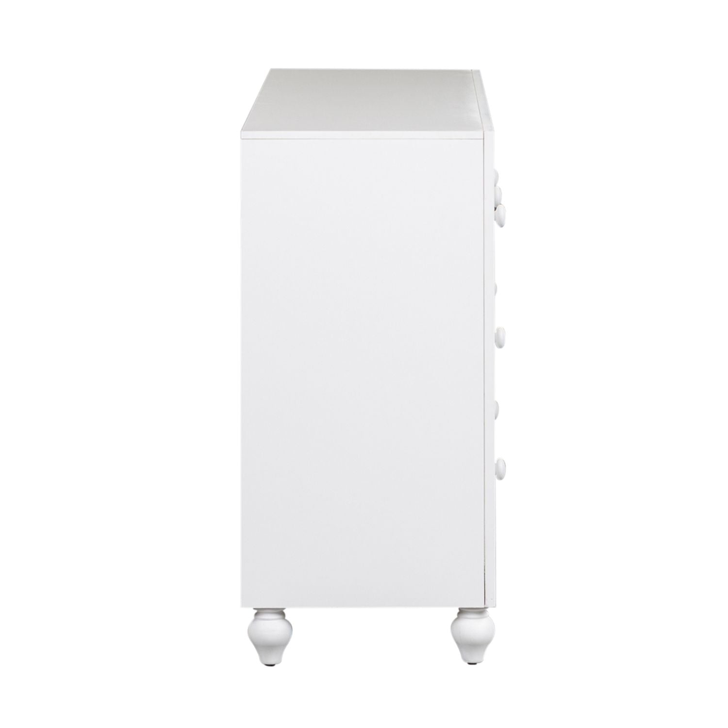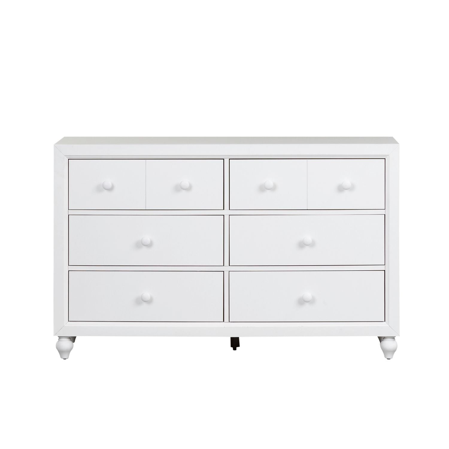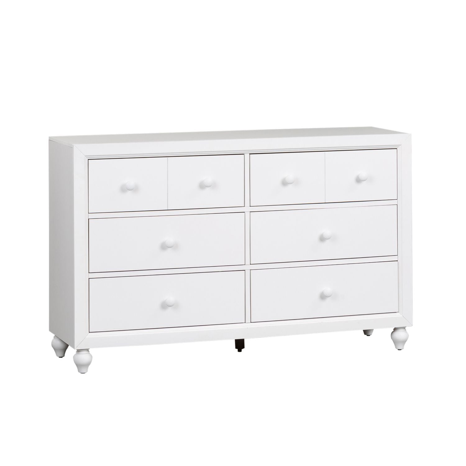 Indulge in cottage design with the Cottage View 6 drawer dresser. Crafted by melamine and a rubberwood solid frame, this piece features a clean white finish, kenlin drawer glides, laminate drawer interior, bluff cut top drawers, bottom case dust proofing, solid wood picture frame moldings, accented by wooden knob hardware and is anchored by bun feet. This piece is available in an alternate finish and the melamine is scratch resistant, sure to make this piece last in any home.