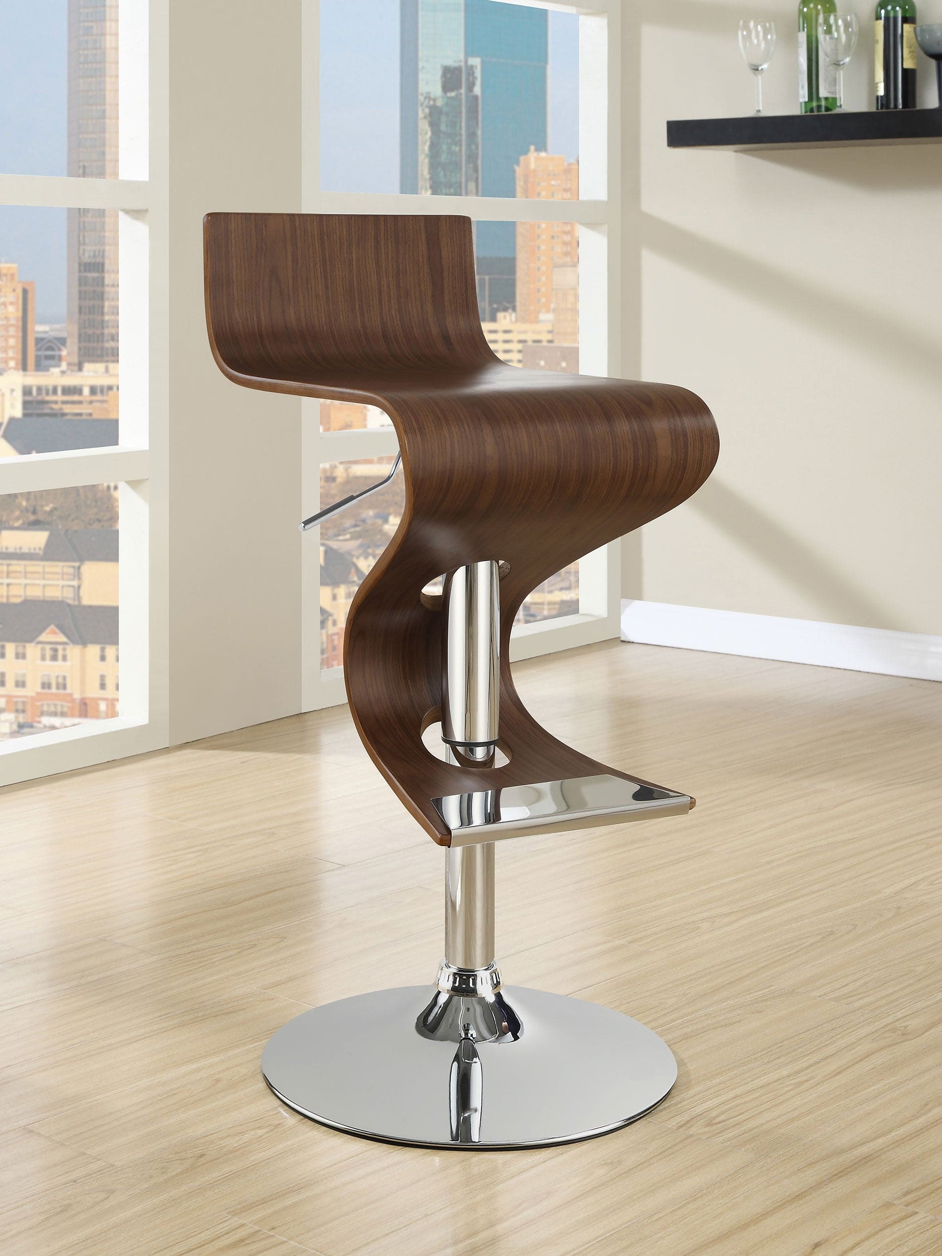 Make a bold statement with the modern silhouette of this creative, contemporary bar stool. Elegant, wave-like curves are offset by a strong, sturdy base, enhancing its modern appeal. A supportive seat back and foot rest add extra comfort to its artistic design. With its attractive walnut wood finish seat accentuated by a shining chrome base, it lends a trendy touch of panache to a kitchen island or wine bar. Conveniently adjustable, this sleek, stylish stool is sure to be a conversation starter wherever you choose to place it.