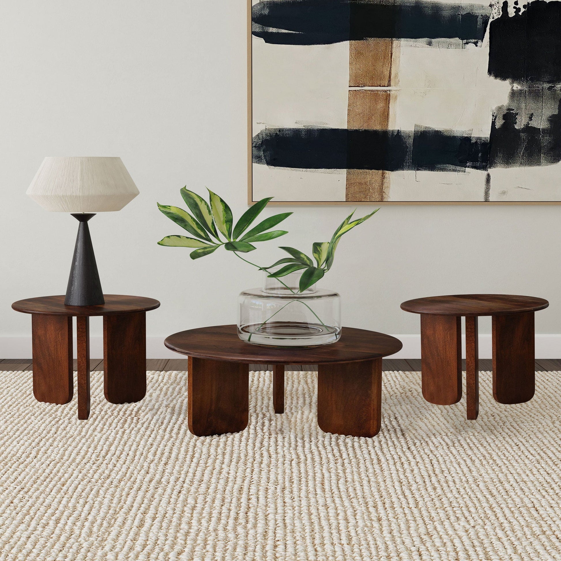 Enhance your living space with this modern coffee table set, featuring a round coffee table and a matching end table. Both pieces are crafted from solid mango wood with a rich brown finish that highlights the natural wood grain. The round tabletops with softly rounded edges offer a sleek yet inviting look, while the distinctive base designs bring depth and visual intrigue. Inwardly angled slab legs with rounded corners provide stability and an artistic touch, creating a cohesive and stylish occasional centerpiece for your home.