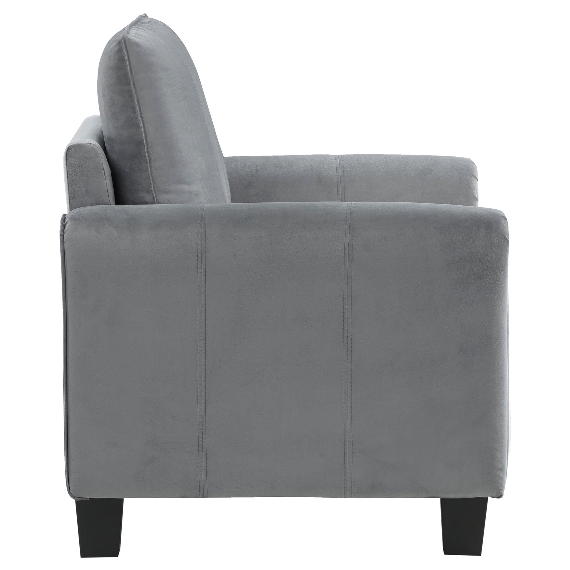 Vertical stitching and rounded arms create a compelling profile for a modern upholstered accent armchair. Perfect for lounging, it boasts velvety soft gray upholstery that's on-trend and versatile in your den or living room. A plush seat cushion sits on sinuous spring decking for excellent support, while the back cushion is reversible. Piping traces the arms and subtle pleating adds the perfect hint of dimension. Tapered block feet in black deliver stability and support and a stylish finishing touch.