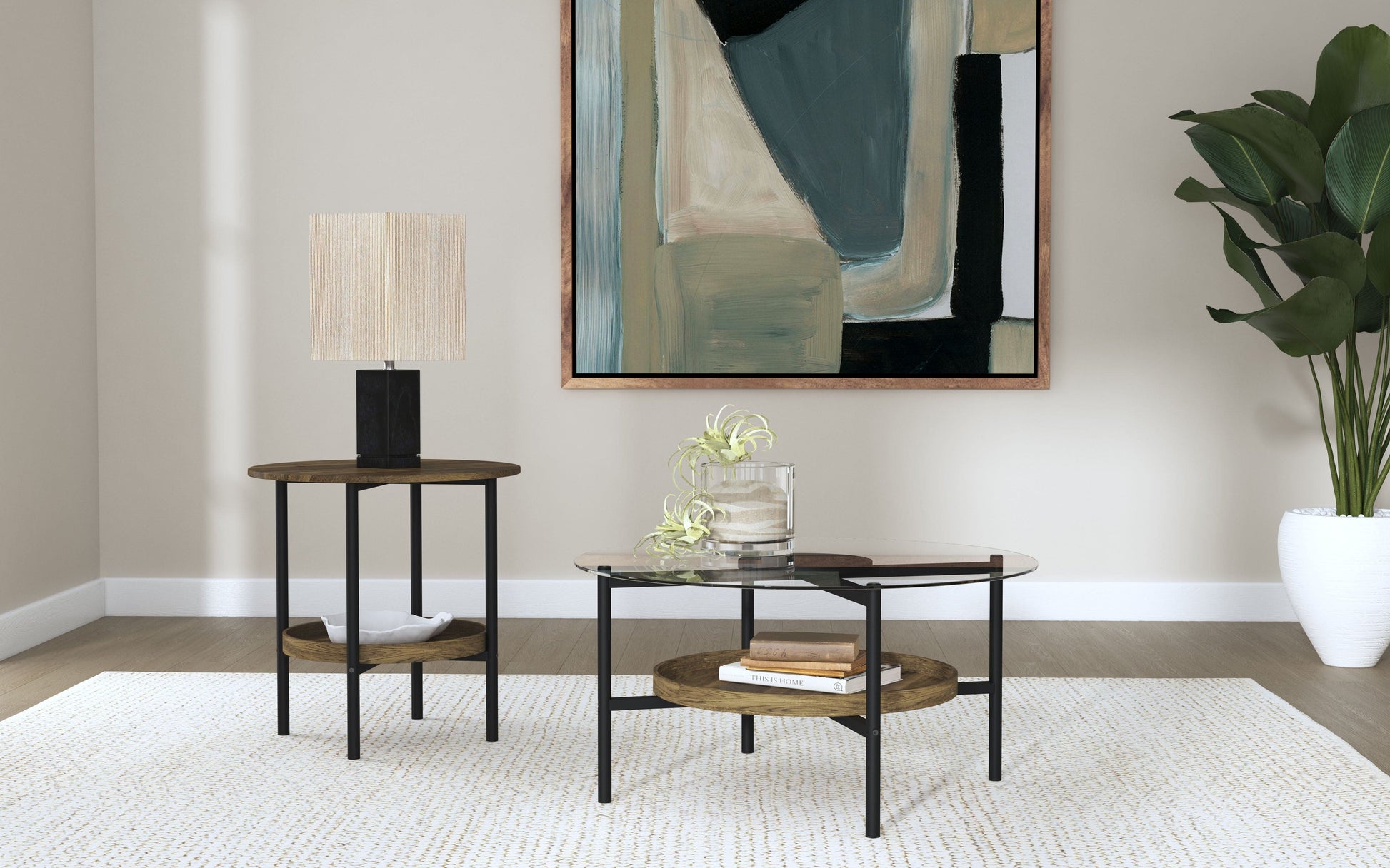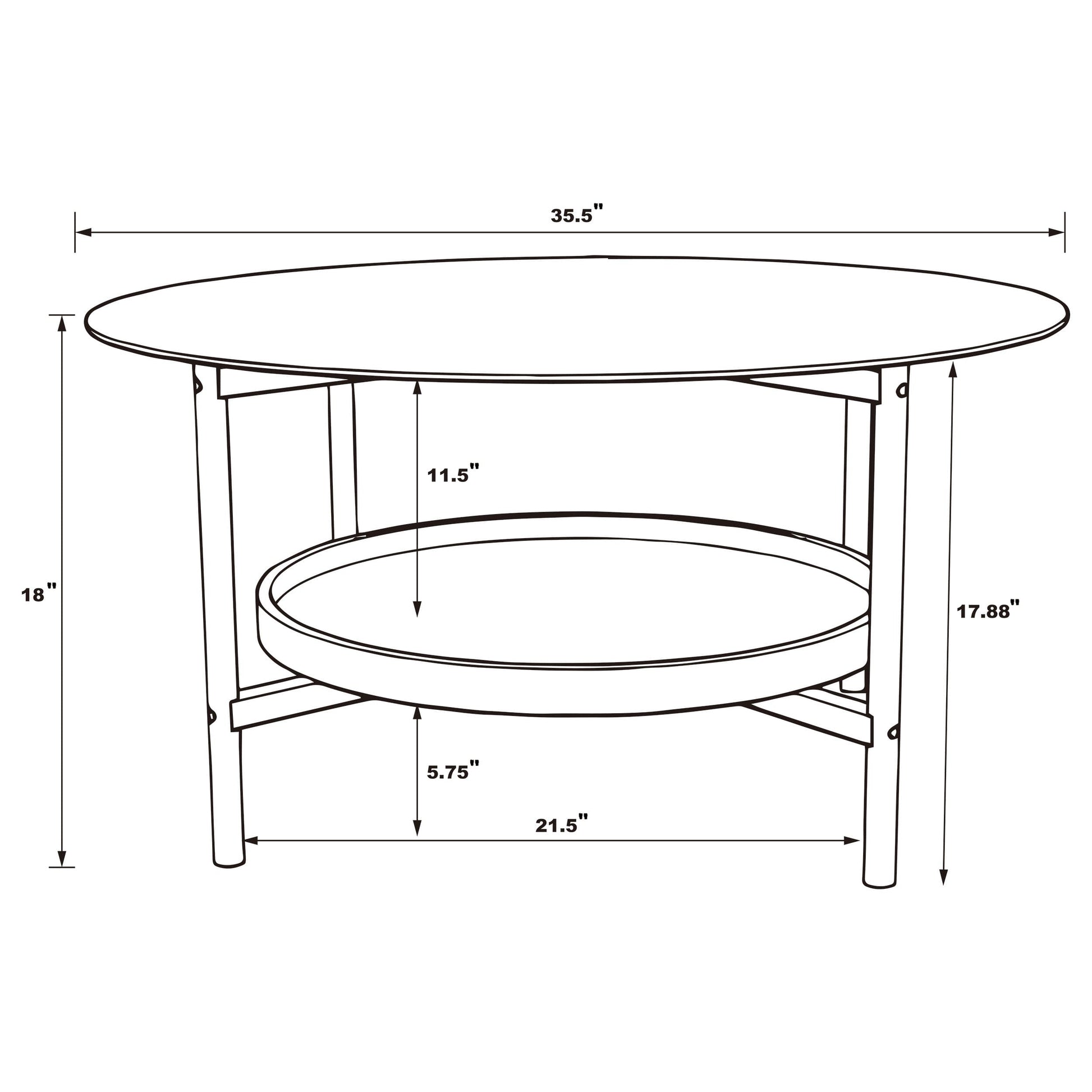 Center your living space with this inviting transitional coffee table that combines farmhouse charm with modern elegance. The X-cross frame is exposed beneath the round tempered glass top, adding dimension and visual interest. A black finish disc at the intersection of the frame offers an artistic touch, grounding the design. Below, the tray-style shelf features a warm brown wood grain finish with laminate veneer, providing both style and function with a subtle contrast to the glass and metal elements to this cocktail table.