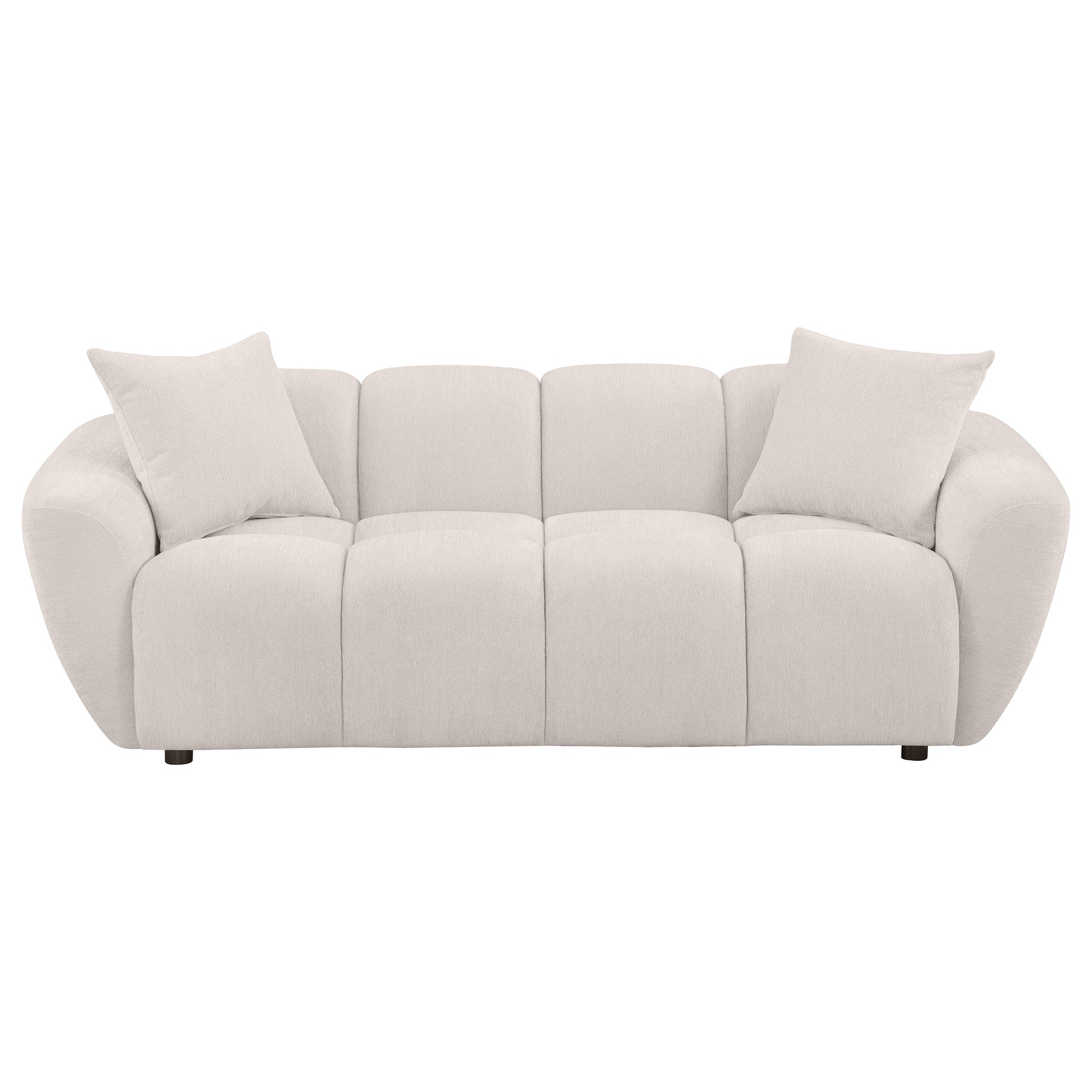 Bold and sculptural, this modern sofa showcases wide splayed arms that frame a grid-tufted silhouette with striking definition. Upholstered in textured greige chenille, its block-like contours are accentuated by deep channel detailing and an attached waterfall seat. Pocket coil construction offers lasting support beneath plush foam padding, while matching knife-edge accent pillows add a tailored finish. This piece blends comfort and statement design in one elevated lounge essential.