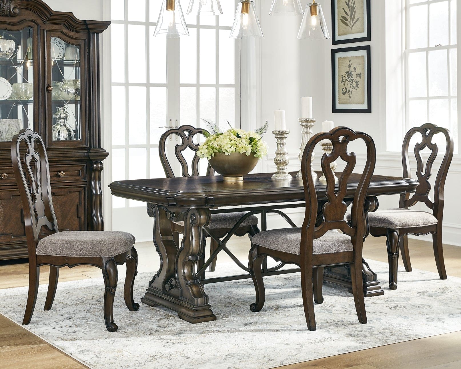 From its ornamental appliques to its large scale, this dining package makes a bold statement. With ornate details, the opulent set wows with stunning style. The look is timeless. The feel? Right at home.