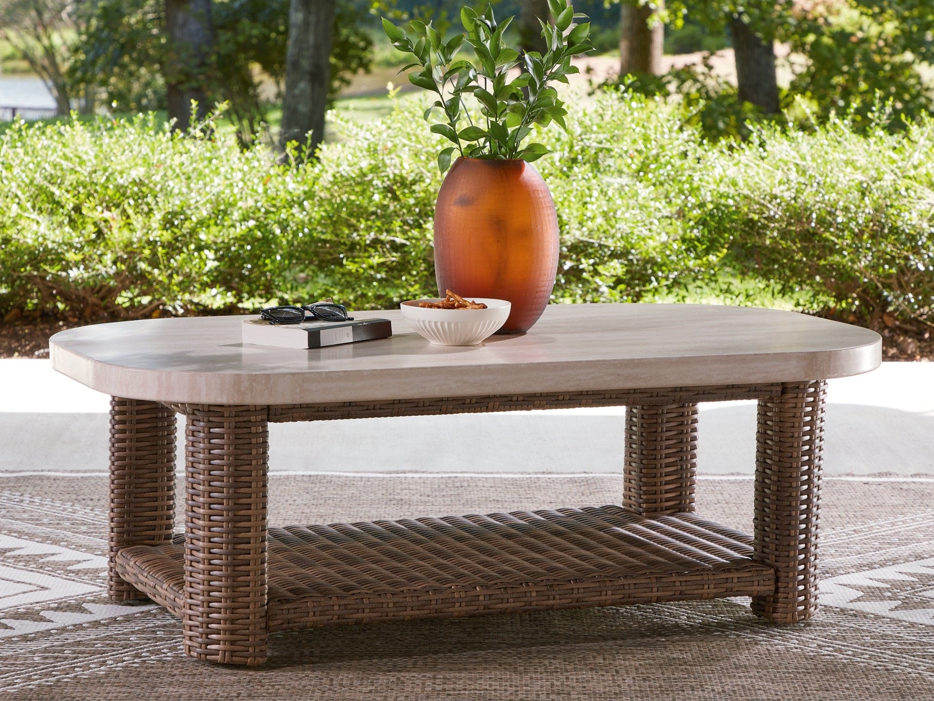 Get back to nature with the relaxed styling of this outdoor coffee table. Crafted with a sturdy aluminum frame and resin wicker, it offers exceptional durability and style. A smooth tabletop with softly rounded edges holds nibbles, sips and more. And don't forget the handy lower shelf. Sounds like fabulous form and function to us.