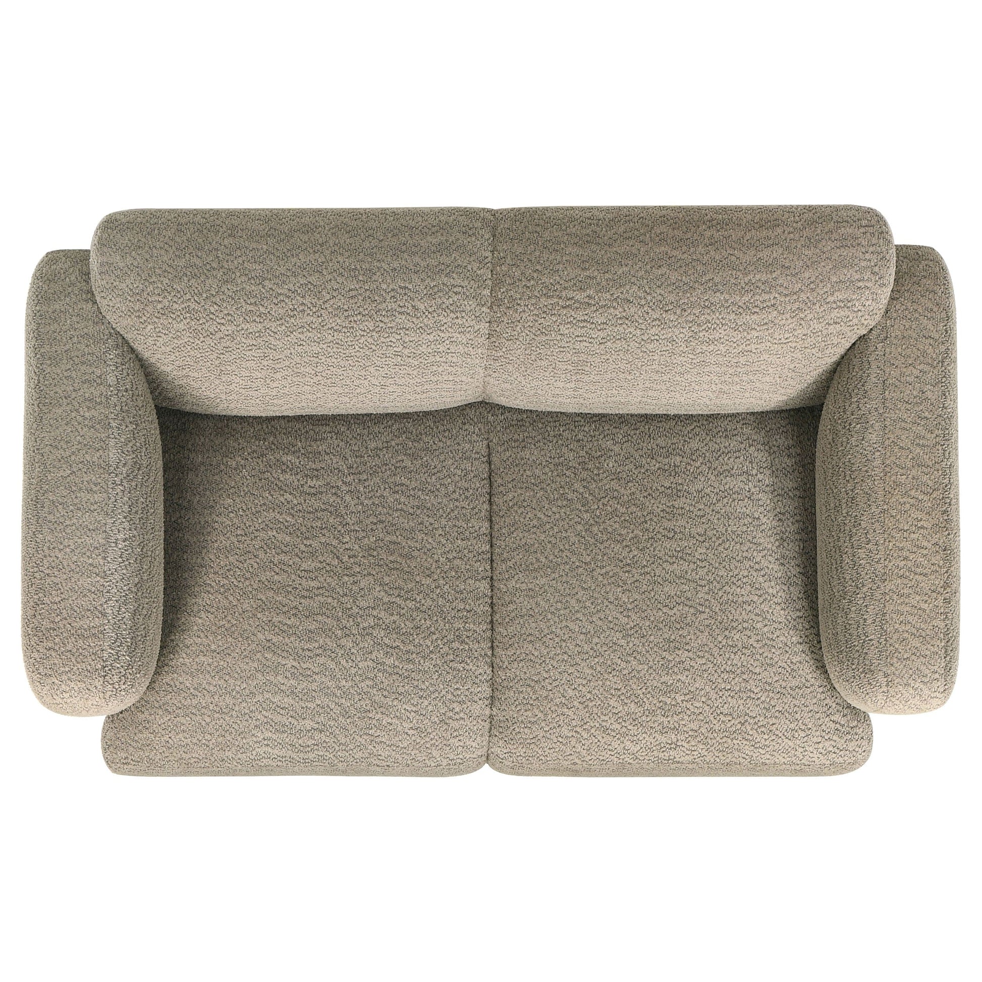 This sculpted loveseat brings bold softness and inviting texture to modern spaces. Its low-profile frame is wrapped in richly textured fabric with a cozy, tactile feel. Rounded track arms and a smooth, contoured silhouette create a cocoon of comfort. High-quality foam and pocket coil seating ensure long-lasting support without sacrificing softness. With a clean, minimal form, this two-seat loveseat adds warmth and refined presence to any living room or lounge.
