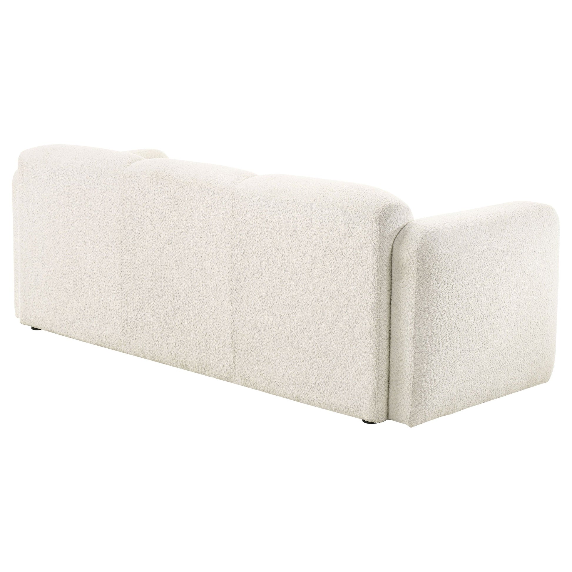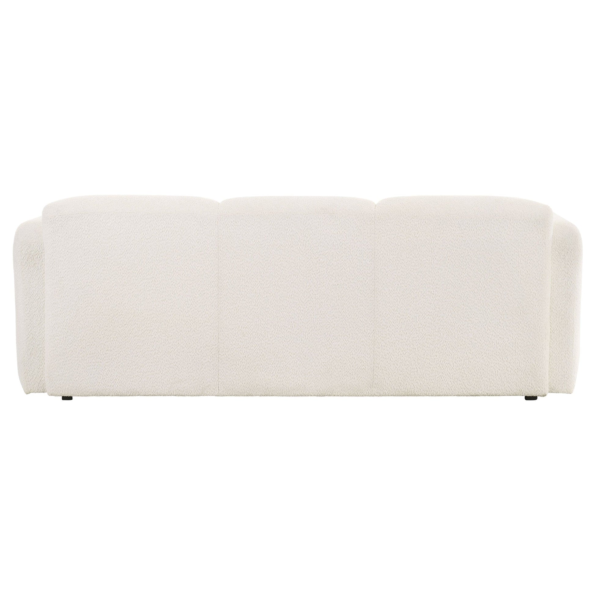 This sculptural sofa blends soft form with enduring comfort for a modern, relaxed atmosphere. Upholstered in a richly textured fabric with a cozy hand, its rounded profile flows seamlessly from the low back to wide, curved track arms. Built with high-quality foam and supportive pocket coil seating, it invites you to sink in and stay awhile. Fully finished and designed for everyday ease, this three-seat sofa anchors the living space with plush, minimalist style.