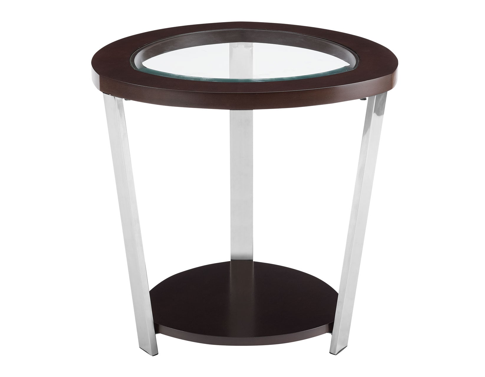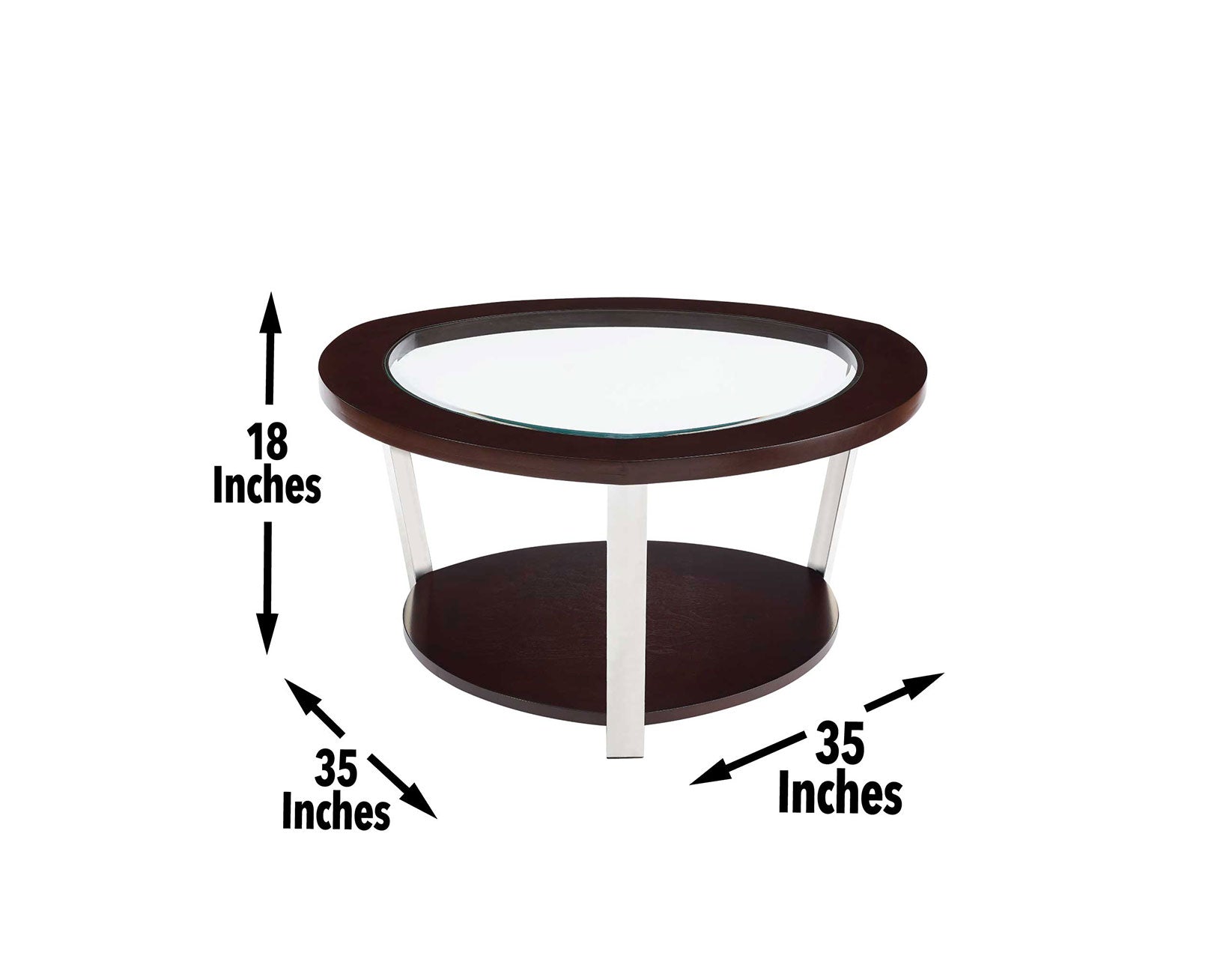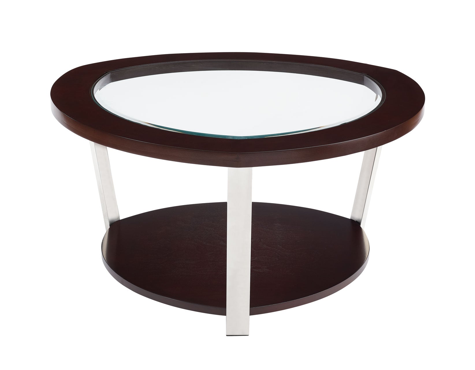 A contemporary styled occasional collection of stainless steel, wood and glass construction, Duncan features a spherical triangular shaped top that will instantly add interest to any room. This 3-Pack of tables includes a Cocktail Table and two End Tables to complete your living room with a rich mixture of elements and espresso finish for a sophisticated modern look.