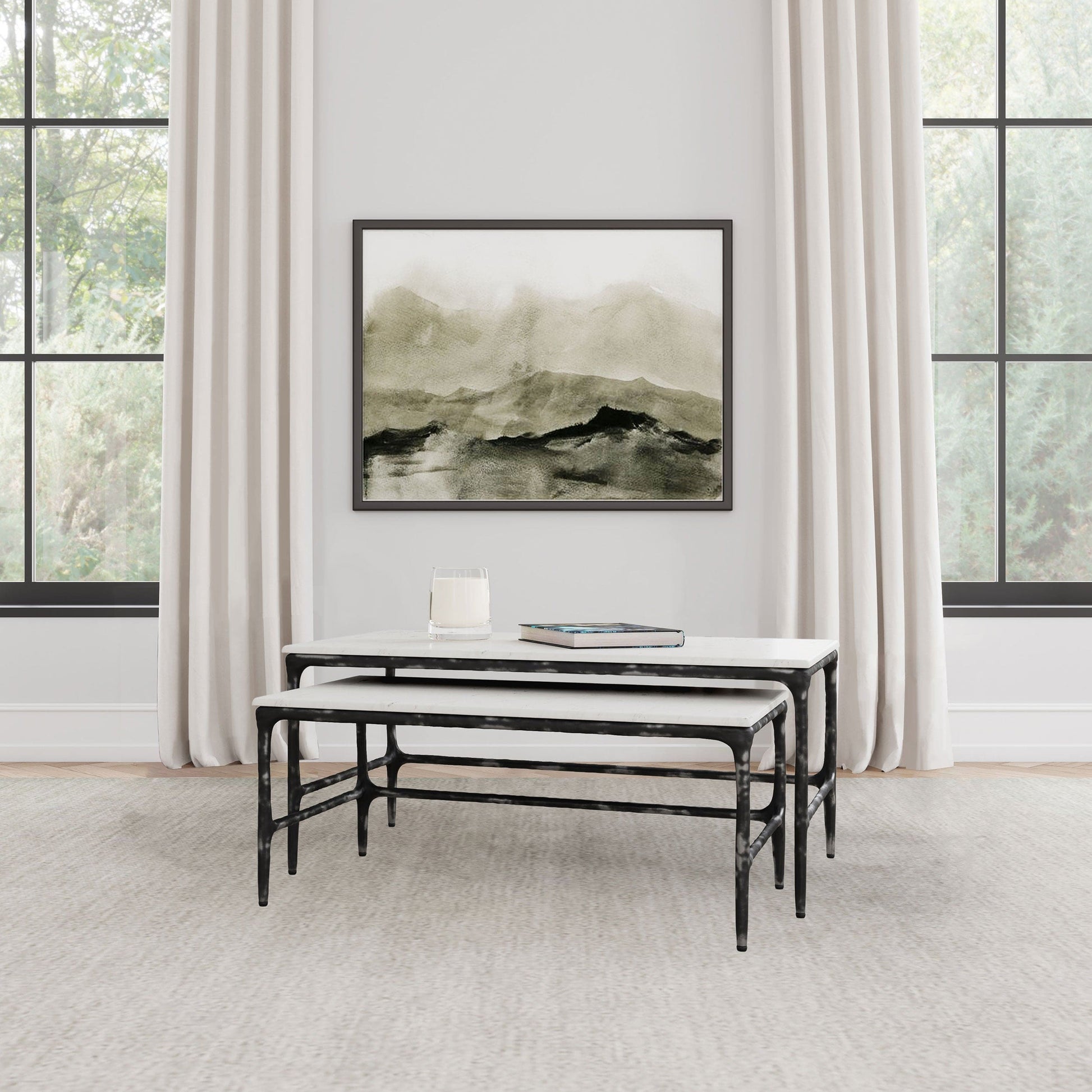 This two-piece nesting set introduces a refined center table solution. Arrange them as a cocktail table ensemble, or separate them to function as a versatile accent table. Each low table includes a genuine marble surface and an antique black iron frame, reflecting timeless sophistication. Their flexible design suits a coffee table configuration, easily adapting to changing needs.