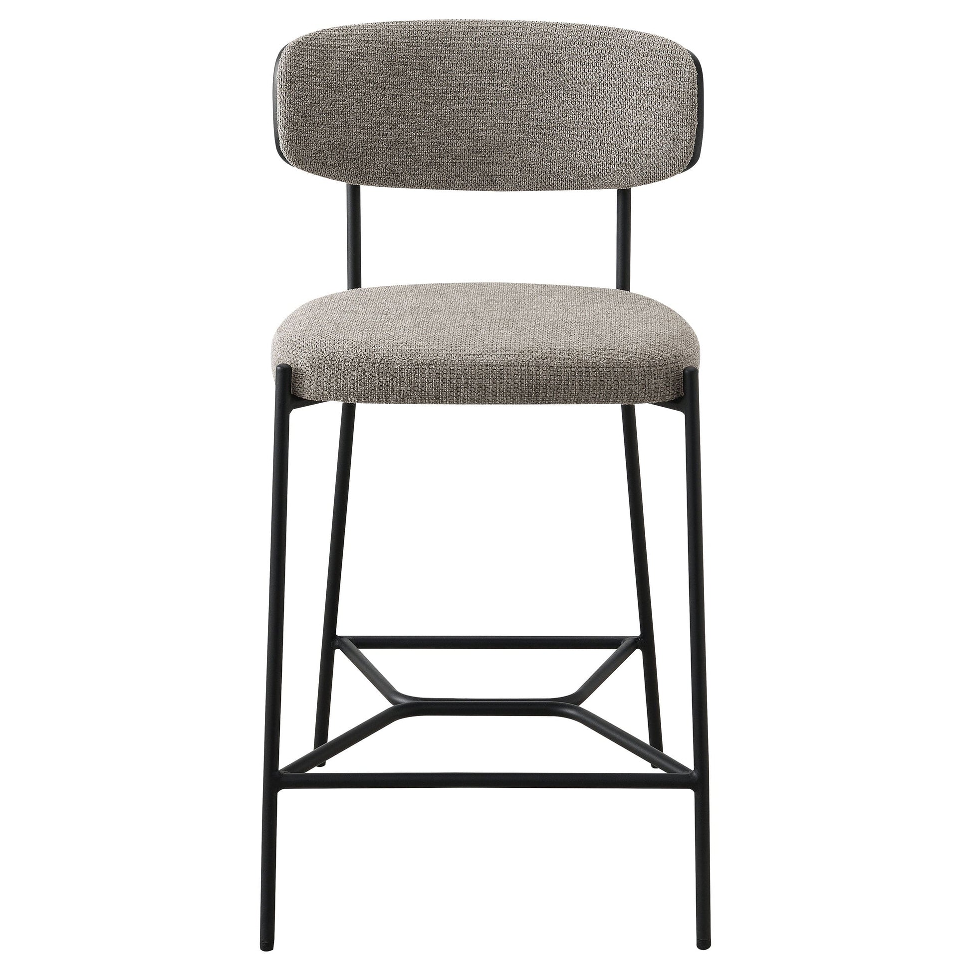 Introduce comfort and style with a set of two contemporary counter stools for your kitchen. Each features a black finish metal frame, offering streamlined character with slim structure and geometric details. Light, neutral upholstery covers foam cushions, creating excellent comfort for everything from meals with the family to cocktails with friends. Each stool features a built-in footrest for added support. Curved backrests add a dark oak finish panel, delivering the perfect hint of dimension and texture.