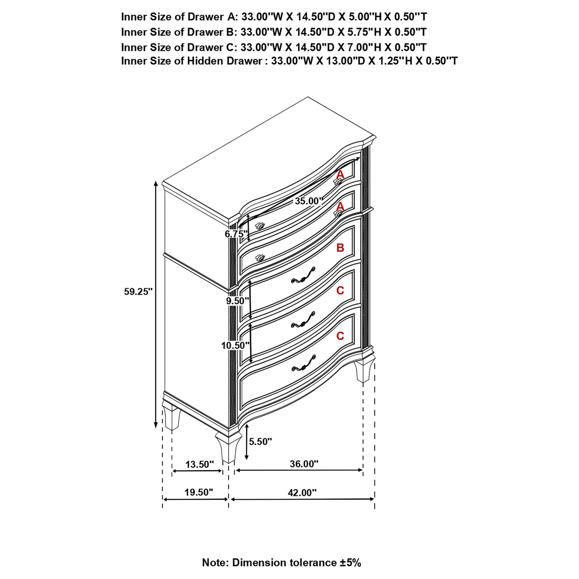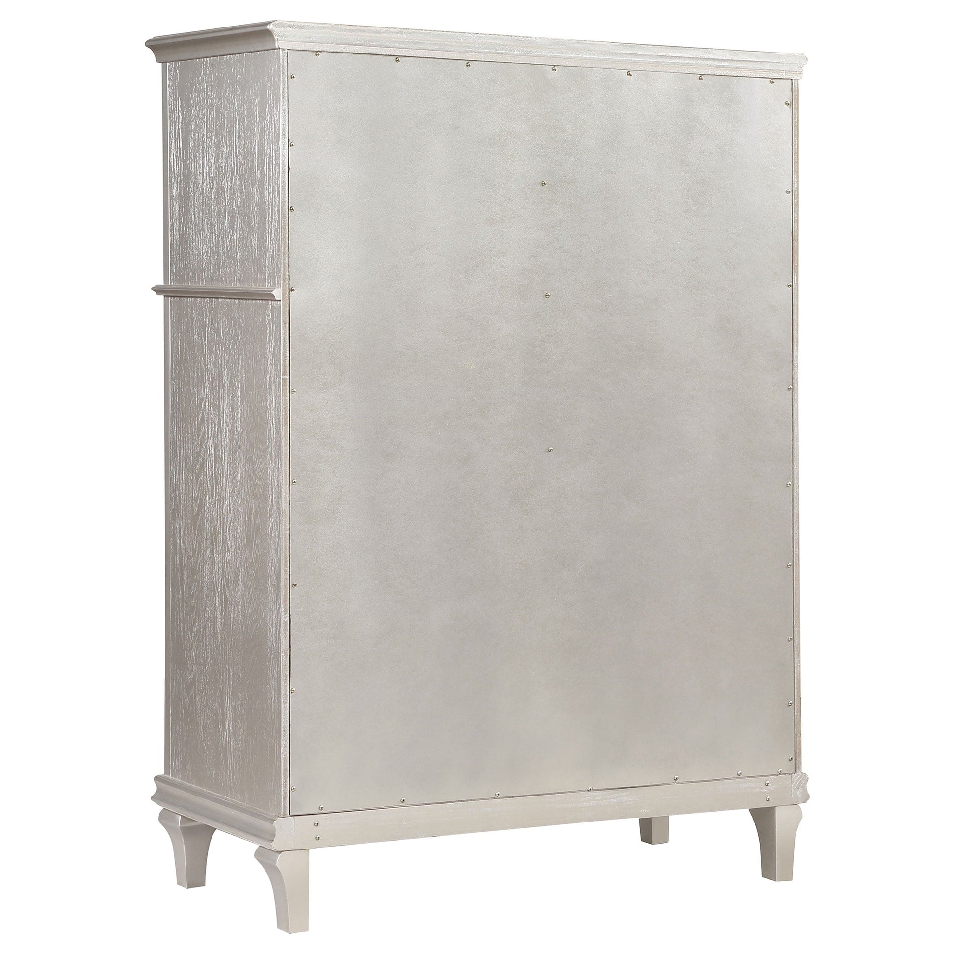 Elevate your guest room or main bedroom with this breathtaking glam chest. The space-saving tall design boasts a curvy front facade, seen throughout the wavy wood trim appointed drawer panels. Five spacious drawers offer ample space for all your bedroom necessities, along with a soft grey felt-lined top drawer for more delicate items. A silver oak finish covers the entire chest frame as slender glittering side panels lend a luxe modern flair. Hexagon-shaped knobs and hexagon-accented drop bail pulls offer a finishing touch.