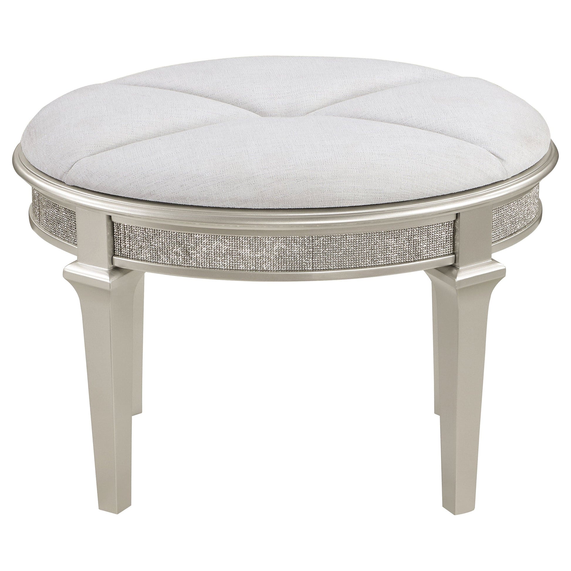 Sleek and sophisticated, this glam stool is the ideal finishing touch for the matching Evangeline vanity desk. Elegantly appointed, it boasts a chic oval shape complete with graceful tapered legs that provide durable support as you primp and prime for the day, or evening, ahead. Its padded seat shows off ivory chenille upholstery, offering just the barest hint of contrast to a soft silver frame finish. Glittering diamond-like trim adorns the apron of the stool, offering the ultimate in sophistication and refinement. When not in use, the backless stool tucks easily under your vanity desk, keeping your bedroom tidy and walkways clear.
