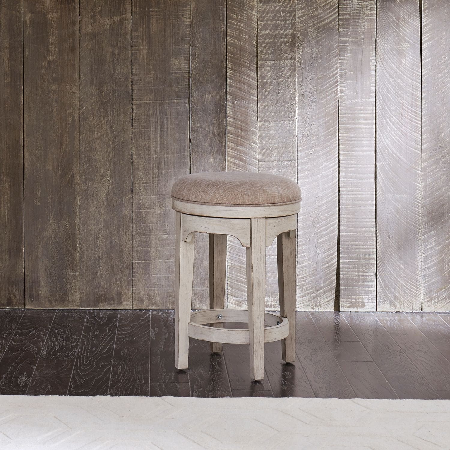 Add a touch of class and style with the Farmhouse Reimagined console swivel stool with upholstered padded seat you could sit comfortably for hours. Feature tapered solid poplar wood legs in a heavily distressed antique white finish.