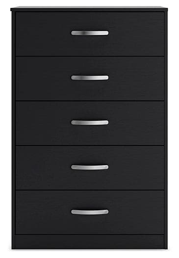 Practical and attractive, this chest of drawers blends seamlessly with modern decor and makes a smart addition to a bedroom. Five spacious drawers will keep your clothes neat and organized. Sleek metal pulls in a brushed nickel-tone finish add to the streamlined aesthetic. Combine with other pieces in the collection to create a room that’s smart and stylish.