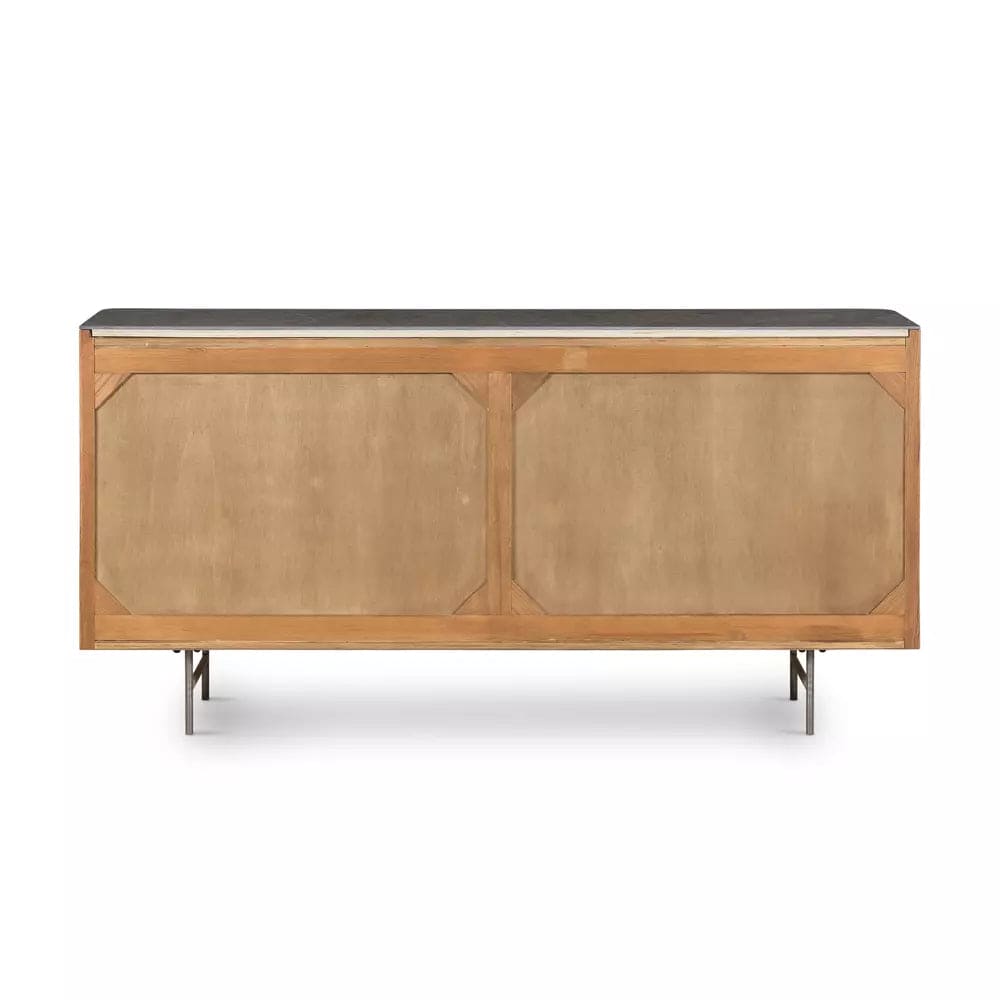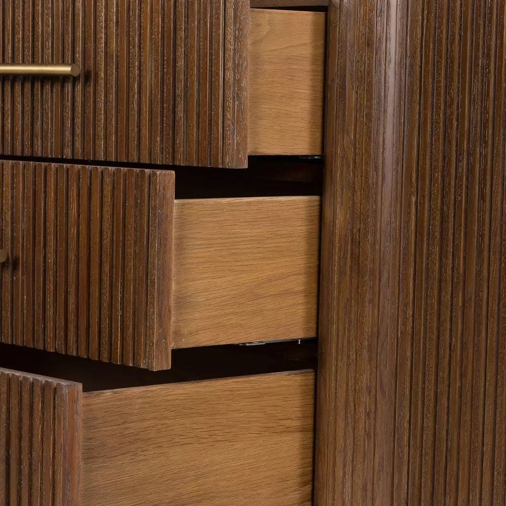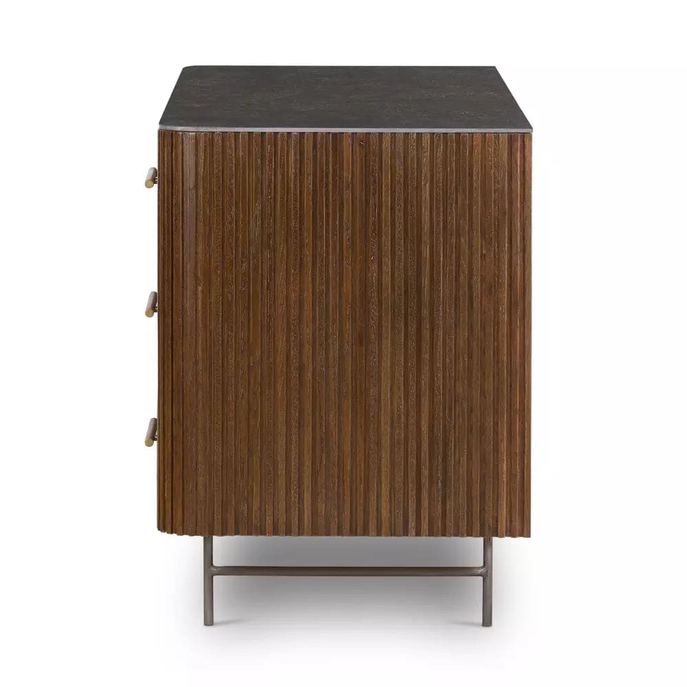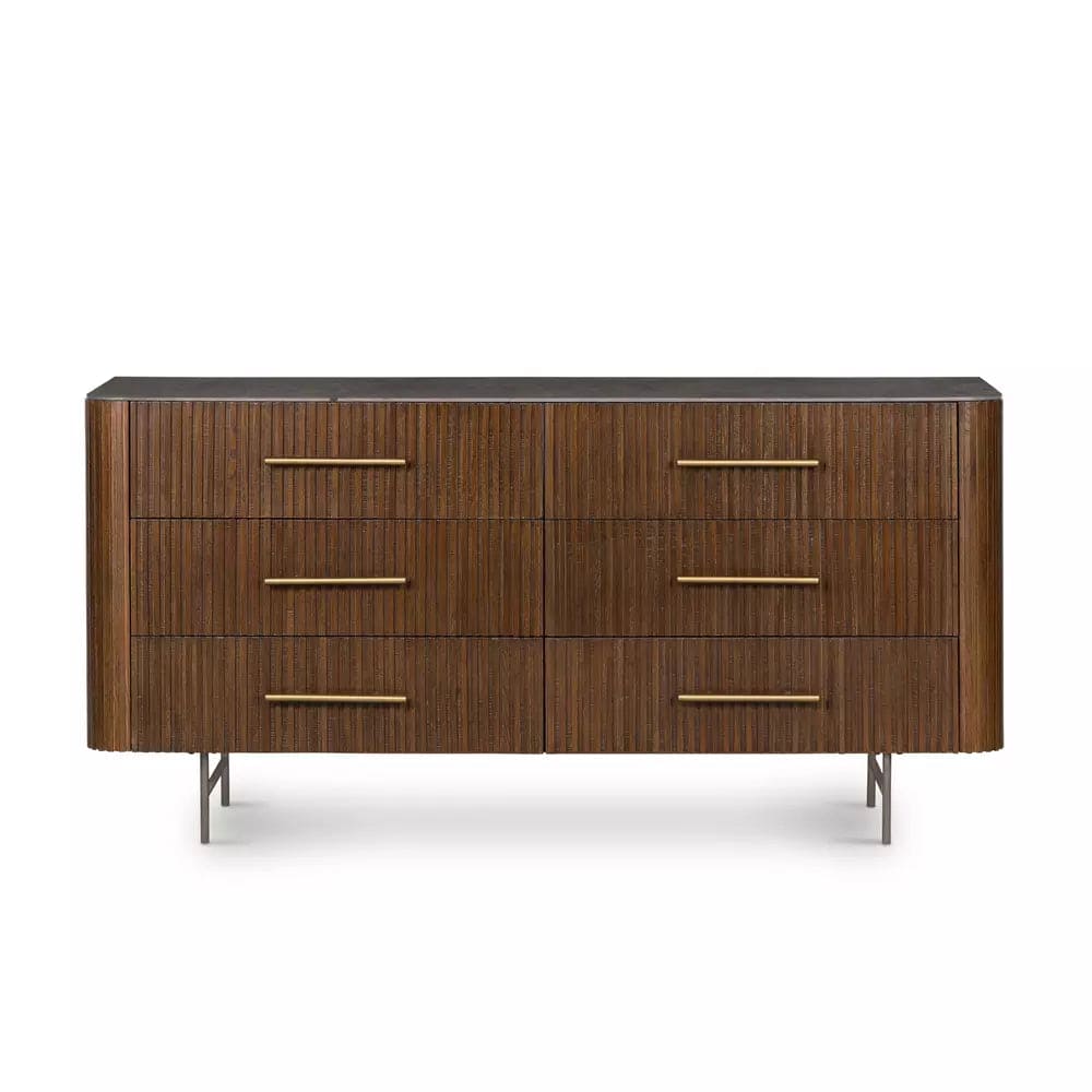 Rich with reeding for great texture and a linear look, brown-finished solid oak flaunts six spacious drawers with polished brass hardware and coolly curved corners, while a bluestone top brings a beautifully complementary material mix to bedroom storage. White mineral lines and subtle color, texture and pattern variations are to be expected and speak to each stone's individual nature.