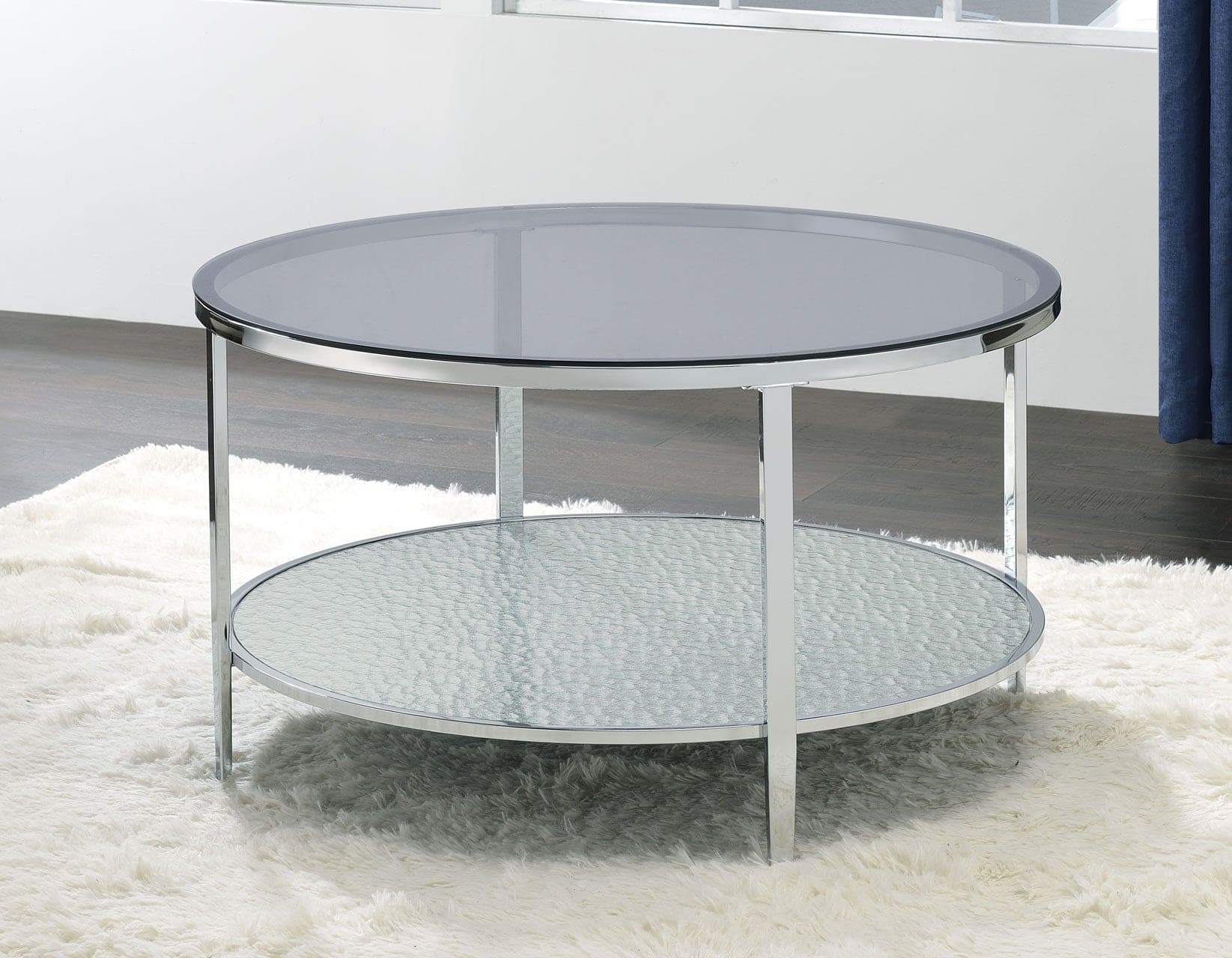 Smoky glass tops, a patterned mirror shelf and a chrome base combine to add sparkle and glam to a room in this romantic set of Living Room tables. Frostine features a round shape that softens a room and makes it easier to navigate by eliminating pesky corners. Use with a Sectional or Sofa and Loveseat sets to add a glamorous touch to your home base