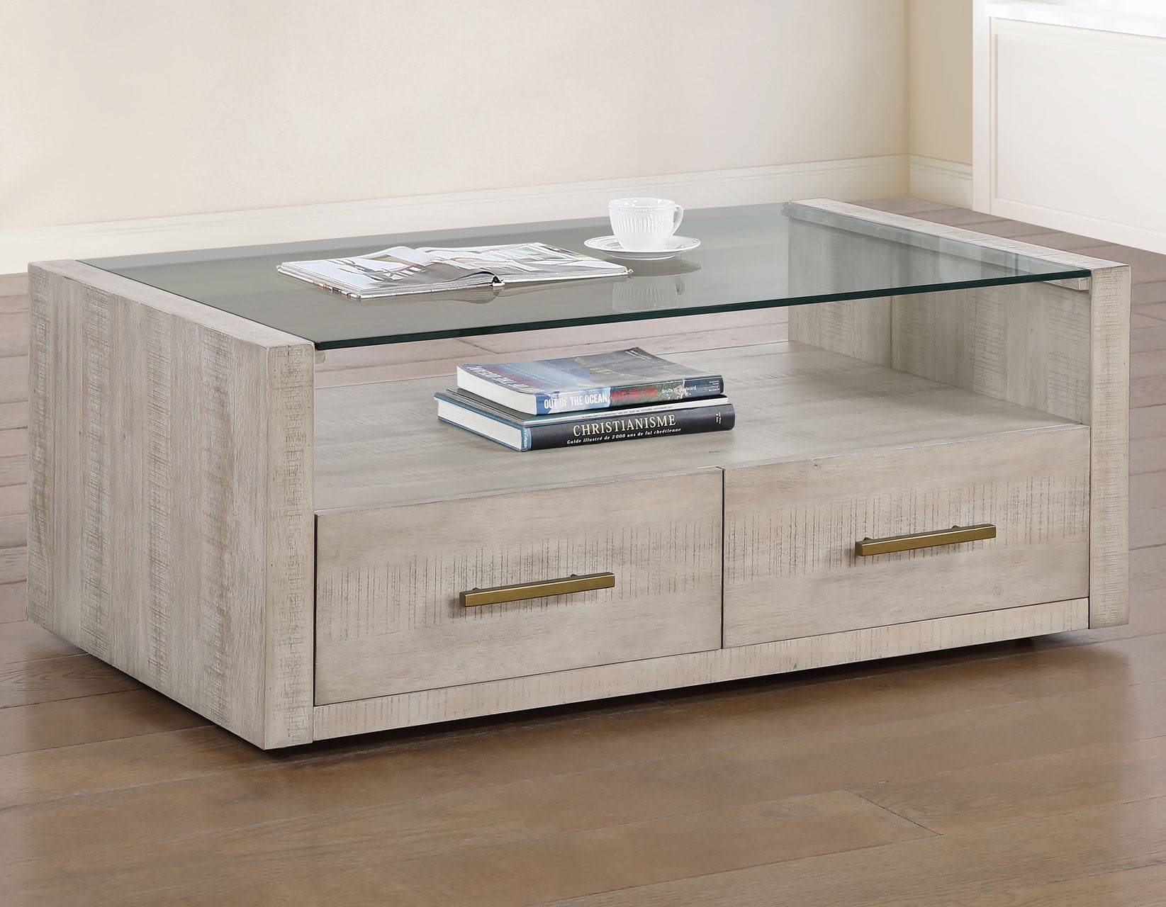 Bring casual elegance to your living room with the Garland 3-Piece Table Set. At the center is the Garland Castered Coffee Table, a stylish blend of modern design and rustic charm. Its clean lines and saw rasp distressing in a modern washed parchment finish create a stunning focal point. The clear glass top offers a lovely display area, while two drawers provide essential storage. Hidden casters make it easy to move, while the matching Garland End Tables complete the set with chic glass tops for versatile side placement.