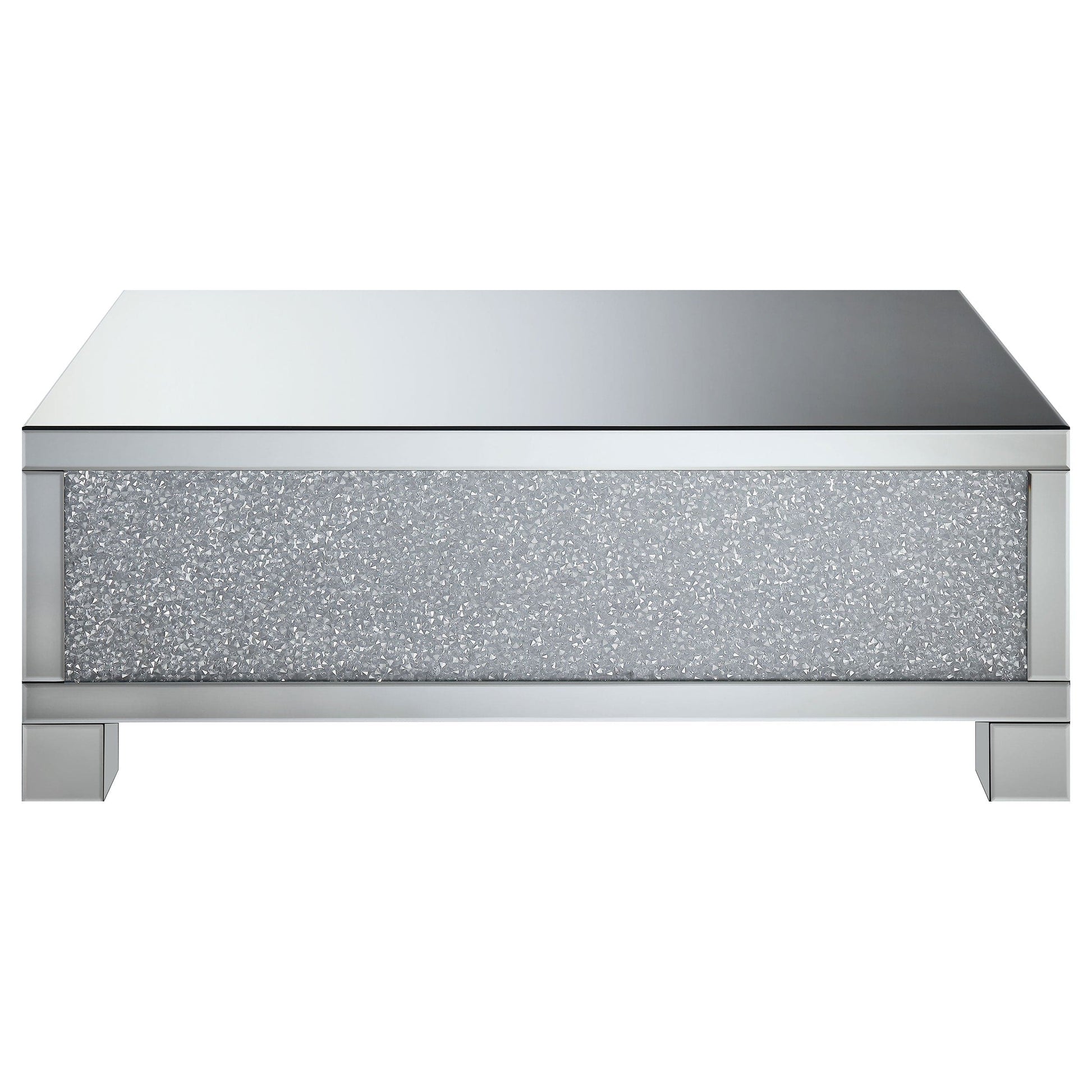 This glam mirrored coffee table set with a 48-inch rectangular coffee table and 20-inch square end table, combining style with practicality. Pieces feature engineered wood frames, fully mirrored surfaces, and dazzling acrylic crystal accents. The sleek designs and reflective finishes add light, dimension, and a luxurious glam vibe to contemporary interiors.