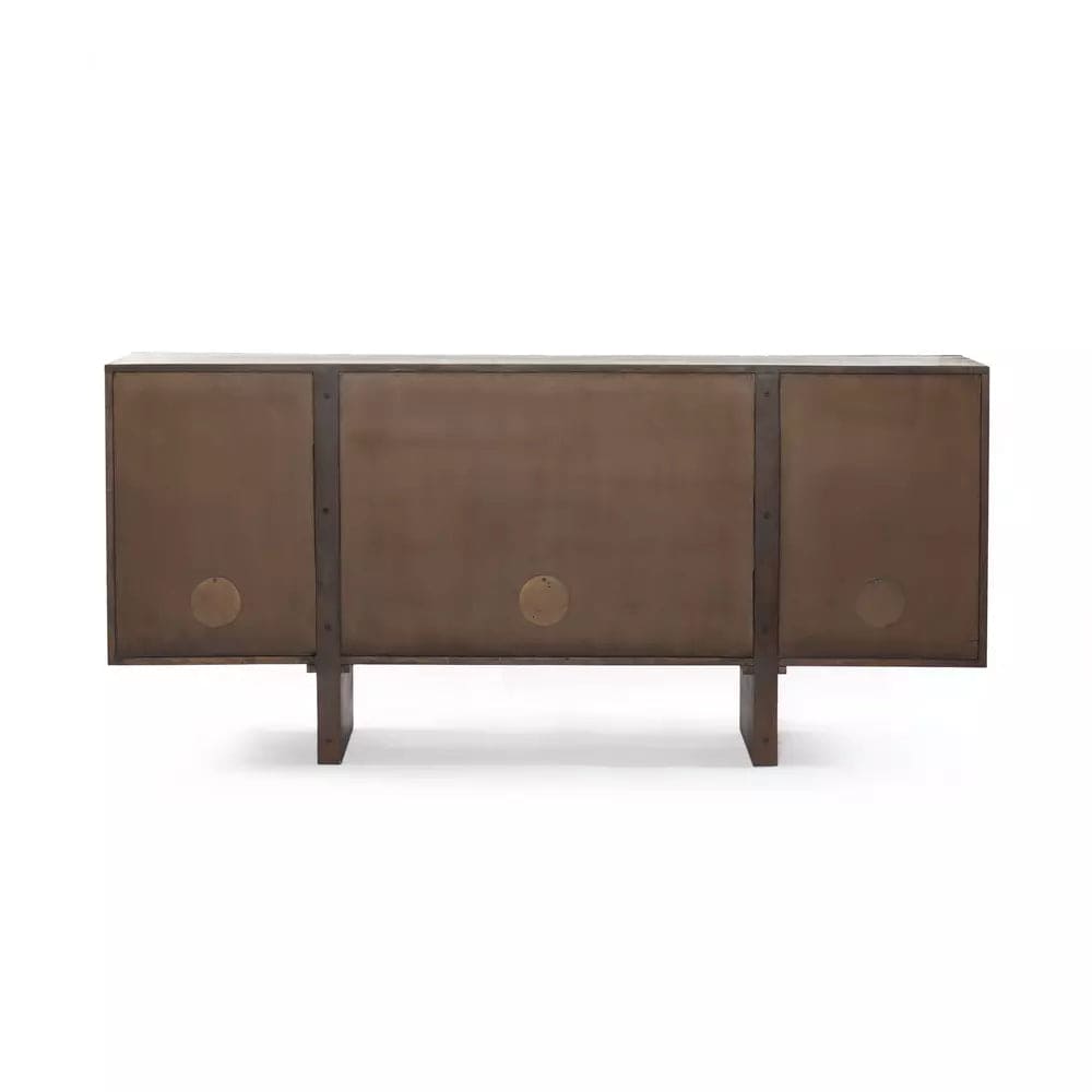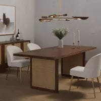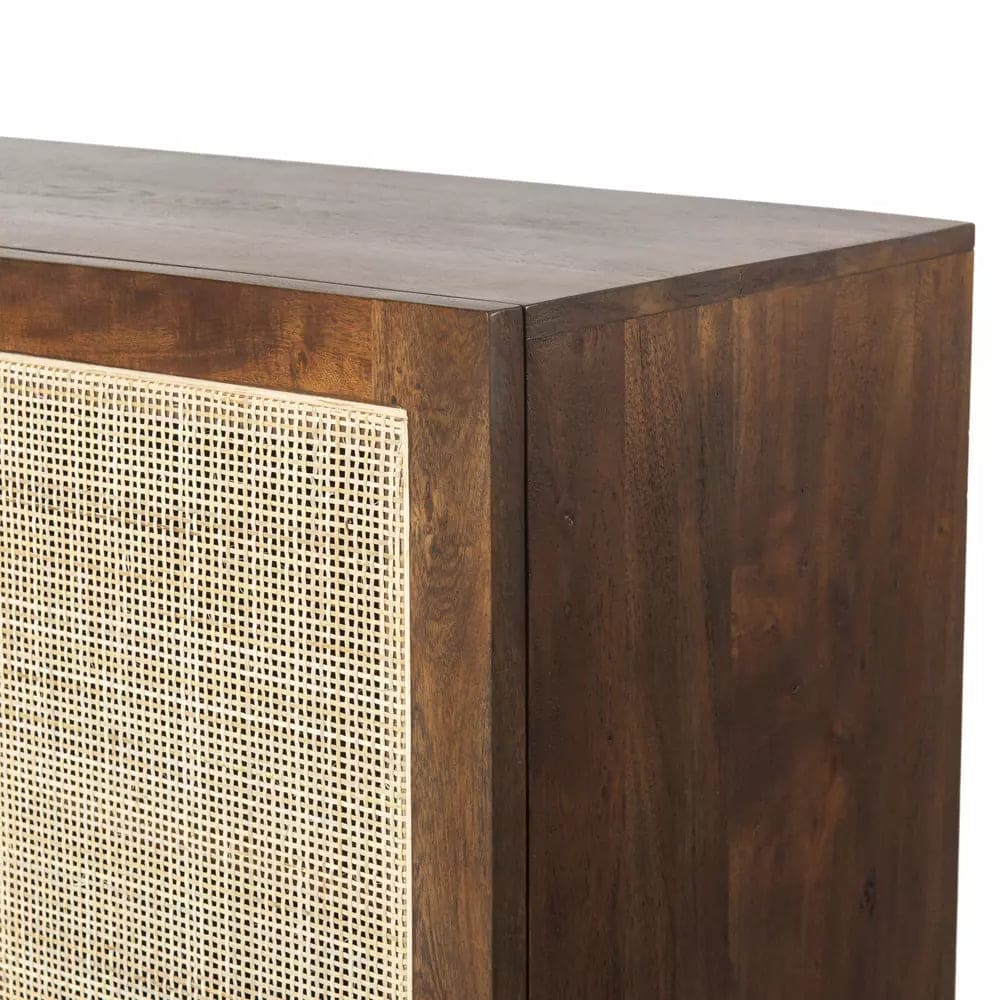 Mid-century inspiration at its finest. Chunky, inset legs of toasted acacia ground a linear sideboard featuring natural cane door fronts, for a fresh, textural twist. A removable faux locking key reimagines traditional hardware into something entirely novel. Rear cutouts for cord management.