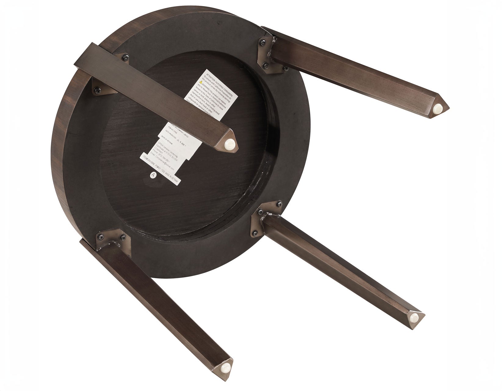 The Gracie 3-Piece Table Set, featuring a 48-inch round cocktail table and two end tables, blends modern industrial charm with elegant design. The cocktail table stands proudly on three monochromatic copper finished metal legs, adding a bold, contemporary look. Its round silhouette with an espresso finish showcases oak veneers in a mesmerizing sunburst layup. The matching end tables complement the cocktail table’s rich and inviting aesthetic. Enhancing any space with their impressive design, this set combines style and functionality, transforming your living area into a sophisticated haven.