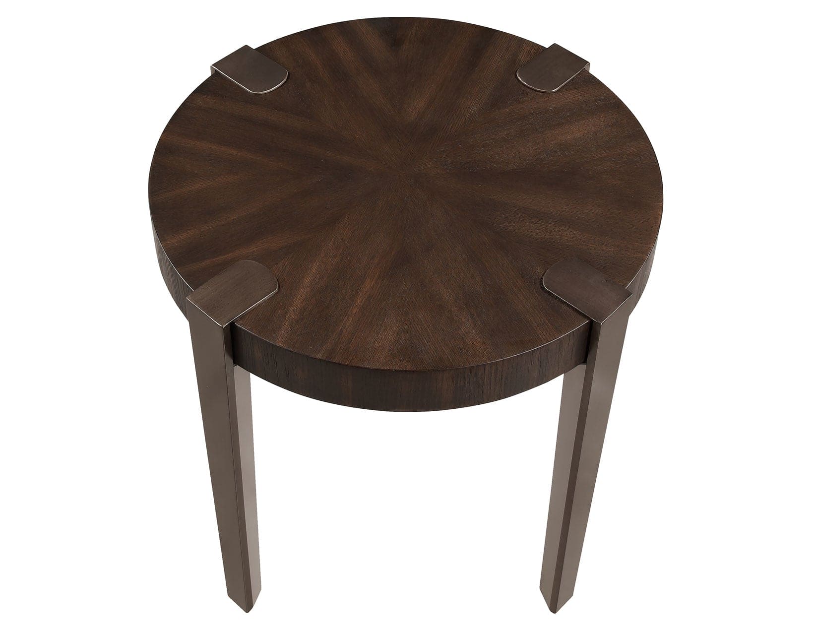 The Gracie  End Table is a stunning blend of modern industrial charm and elegant design. With a round, flowing silhouette and an espresso finish, it showcases oak veneers in a mesmerizing sunburst layup. The copper metal legs, geometrically shaped and exposed on top, add a bold, contemporary look. Ideal as a side table beside a chair or between upholstered pieces, it brings style and functionality to any room. Rich and inviting, this distinctive piece enhances any space with its striking design.