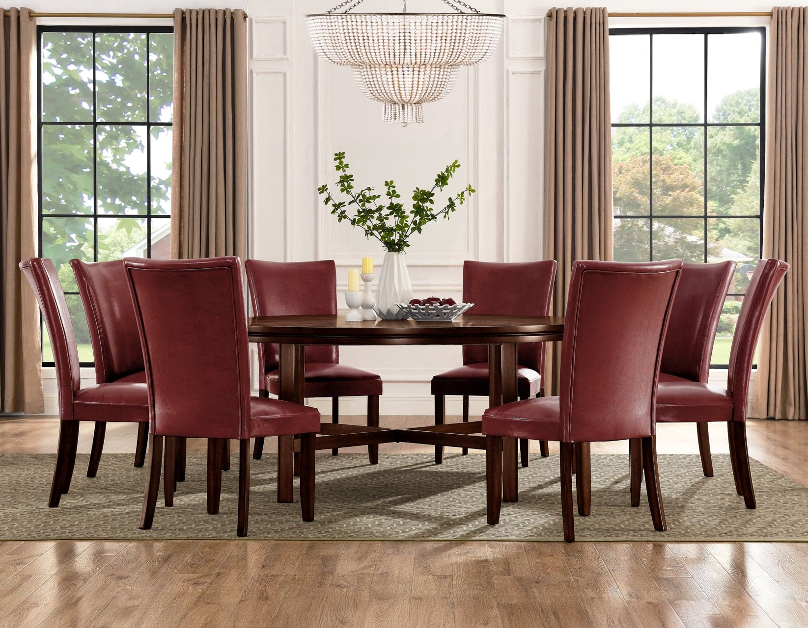People love round dining tables and Hartford presents a wide range of choices for this shape table. The conversation will just seem to flow around the table with this and 52-inch table. The deep espresso finish and brown or red polyurethane chairs offer a great choice for any transitional dining area and the lazy susan makes serving a breeze.