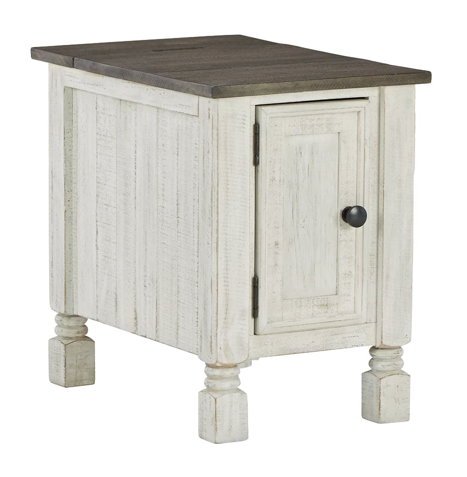 What a fresh interpretation of country classic style. Inspired by American farmhouse craftsmanship, but with an elevated sensibility, this chairside end table blends distinctive details such as turned post accents and raised door fronts for a substantial look that feels right at home. Those who appreciate rustic character should take note of the table’s thick crown moulding, beautified with a vintage two-tone finish. A small flip lid located on the top conceals a power outlet and USB ports to keep electronics charged up and close at hand