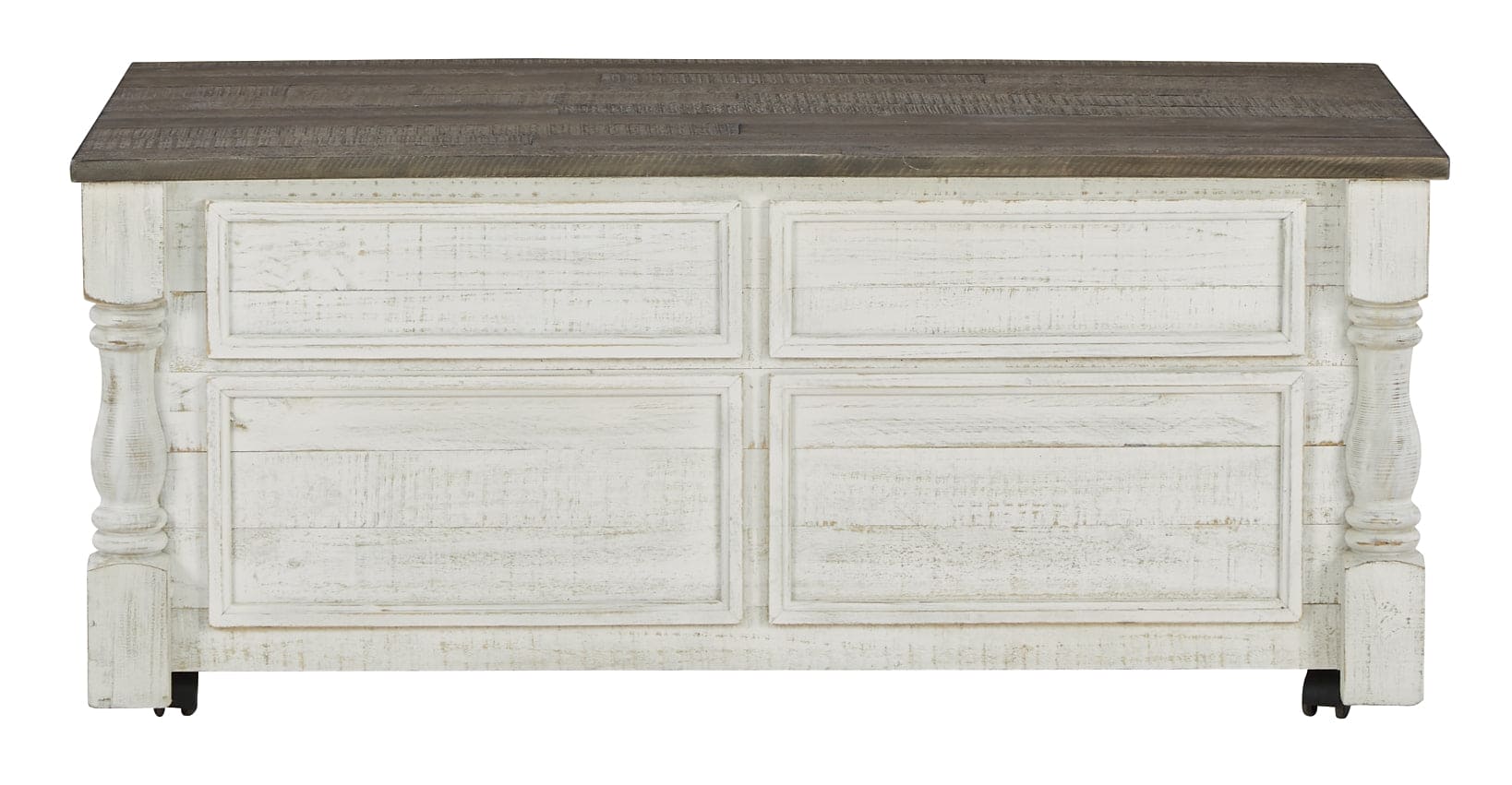 What a fresh interpretation of country classic style. Inspired by American farmhouse craftsmanship, but with an elevated sensibility, this lift-top coffee table blends distinctive details such as turned post accents and raised drawer fronts for a substantial look that feels right at home. Those who appreciate rustic character should take note of the table’s thick crown moulding, beautified with a vintage two-tone finish. It features four storage drawers, a small concealed storage tray under the lift-top, and robust legs that are ready to stand the test of time. And casters allow you to roll it wherever you like.