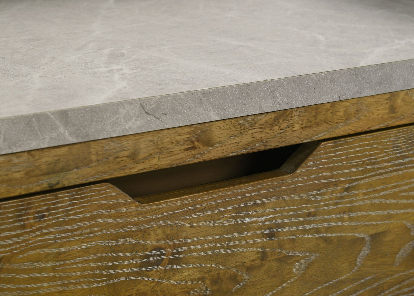 Rustic charm meets modern refinement in this five-drawer chest of drawers, where natural textures and contemporary lines come together in perfect balance. The embossed oak grain surface is finished in a warm medium oak tone that highlights the richness of the solid rubberwood construction. A faux marble melamine top adds a touch of elegance, while the sculpted finger pulls and heavy-duty glides ensure smooth, quiet function with every use.