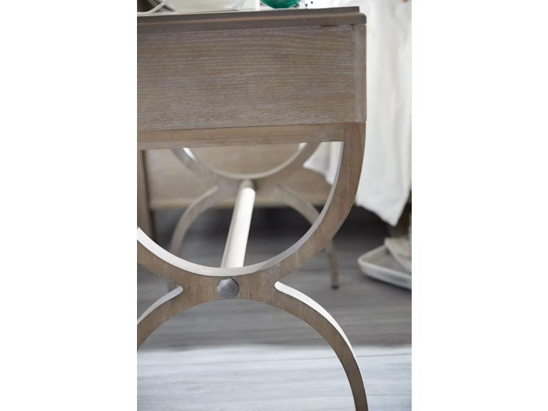 Sleek and sophisticated, the Affinity Leg Nightstand blends a simple one-drawer top with a pewter and antique white bar pull with an intriguing base combining rounded X-motif legs and a center stretcher. Crafted of Oak Veneers, the nightstand is finished in a wire-brushed greige and antique white finish. Soft, rounded forms combine with sand-blasted greige and antique white finishes to create an inviting transitional boutique collection in Affinity. The main finish for the 20-piece collection of bedroom, dining room, occasional, accents and home entertainment is a wire-brushed greige (gray/beige) on quartered white oak. Pewter and antique white hardware and soft linen fabrics add intrigue.