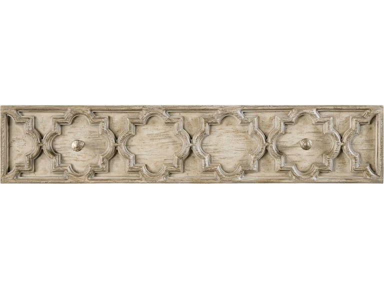 In a European provincial silhouette with a Moroccan flair, the Bellissimo Bachelors Chest is adorned with geometric motifs on the front, and a two-tone finish treatment. Pottery, or dark gray, is on the outside of the case, and Light Tusk, or light taupe, is on the drawer fronts. A touch of elegance is added with hand-hammered Florentine gold knob hardware. The three drawers have self-closing undermount drawer guides. In the top drawer is a drop-in felt liner and the bottom drawer is cedar lined. Three-plug electrical outlet. Delivering the casual look and feel of ageless pieces acquired during travels in the Old World, Hooker Furniture is featuring Alfresco, a whole-home collection with relaxed European provincial styling. The Alfresco collection has a well-traveled aesthetic that is inspired by heirloom pieces found in homes perched on cliffs along the Italian coastline of the Adriatic Sea. The collection of bedroom, dining room, occasional and accent furniture features moderately distressed designs that are enhanced by accent paint finishes that create an eclectic feel. Alfresco is constructed of oak, maple and hickory veneers and poplar solids, and includes several pieces with stone and metal accents.