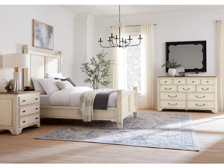 Finishes: Daisy finish on base and Honey finish on top. The Americana Daisy finish is a time worn white finish on cathedral oak veneers representing the natural wear one might expect of pieces passed down through the family over time revealing the rich oak character beneath. The Americana Honey finish features a gentle, warm brown tone. The distressing hints at the passage of time, while the smooth surface invites you to run your fingers across it, connecting you with the generations who came before. Metal alloy pulls in an antique bronze finish.