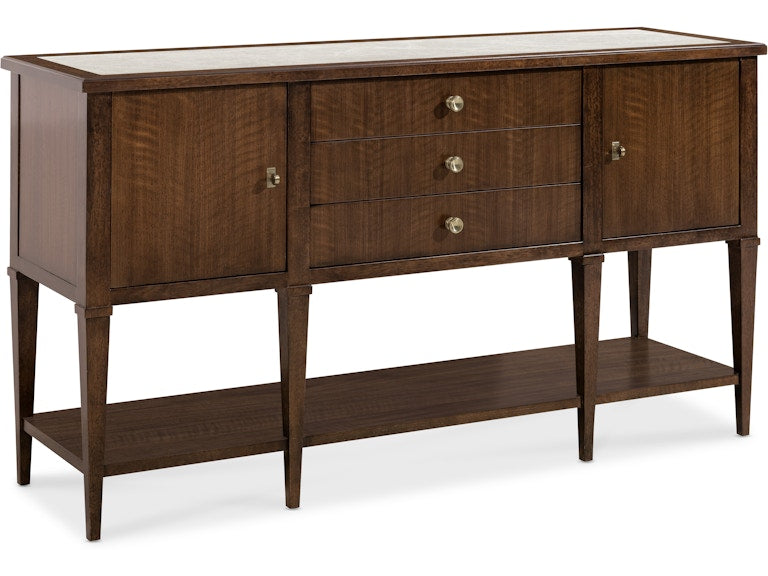 Make a sophisticated statement with the Archives Server, combining refined materials like figured walnut veneers, and a striking Castle Grey marble top. The high clarity Classic Walnut finish enhances the server’s depth and richness, while satin brass hardware adds a luxurious touch. Featuring two doors, three drawers, and an adjustable shelf, this server offers ample storage space, including a silverware tray. Perfect for the dining room, this piece offers both practical function and timeless design, ideal for those who appreciate structured elegance. Archives taps in to a design trend that mixes modern, trendy styles with historic elements, known as "hipstoric". Complementing a variety of design styles with timeless forms and elements, the trend creates a sense of undeniable luxury. Layering rich and authentic materials, such as figured walnut veneers, top grain leather, woven raffia, and polished marble, Archives’ assortment speaks to consumers who yearn for structured elegance with a dash of mystery