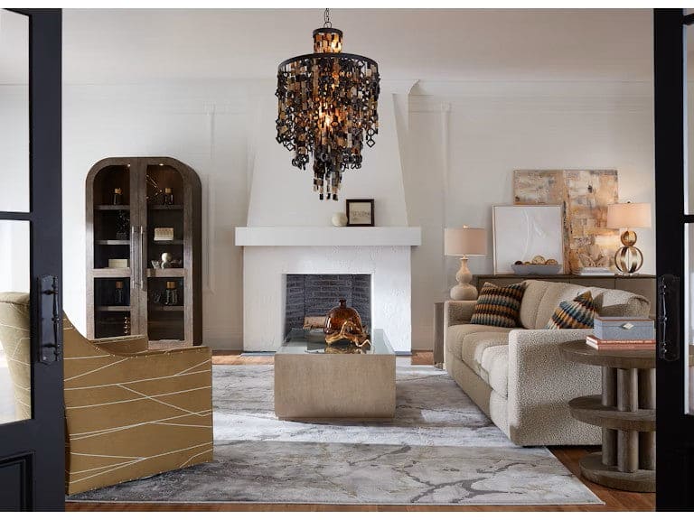 Architectural and timeless with a luxe mixture of materials, the Modern Mood Arched Display Cabinet combines Oak Veneers, Metal and Glass in a stunning statement piece. Crafted of Quartered Oak Veneers with wire-brush detailing in the softly-sophisticated Diamond finish, the cabinet has two wood-framed tempered glass doors with soft-close hinges and magnetic catches. Behind the doors are two adjustable wood-framed glass shelves with plate grooves and two puck lights with a three-intensity touch switch on the right side of the back panel. The metal-wrapped base and the metal bar pulls are both in a warm pewter finish, and the bar pulls are accented with leather. Unbound by geographical design, Modern Mood presents itself as an evolution of design choices, spanning a variety of decades and design movements, while maintaining an unmistakably modern aesthetic that transcends time. The 90-piece collection includes bedroom, dining room, home office, accent and occasional items characterized by substantive forms with soft architectural details. Elevated materials and brushed metal accents in a warm pewter finish are evident throughout the collection, including metal banding and edging as well as marble and glass accents. Crafted with flat cut quartered oak veneer with wire-brushed detailing, Modern Mood is presented in two finishes: Mink and Diamond. Delivering a dark, earthy brown with notes of black, Mink delivers a timeless aesthetic. A much lighter presentation is achieved with the crystal-like alabaster and pewter hues of the Diamond finish, delivering a soft sophistication.