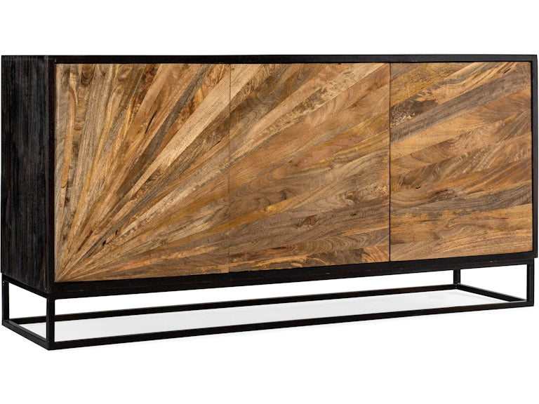 An exuberant sunburst-like wood veneer pattern in a natural finish on the front of the Commerce & Market Entertainment Console contrasts with a black finish on the sides and top and an iron metal base for a bold silhouette. There are three doors with push latches. The pair of doors on the right side open to one adjustable shelf, and the left-side door opens to two adjustable shelves. Ventilated back panel with wire management behind all doors. Crafted of Mango Solids, the console accommodates up to a 65-inch TV. Targeting the next generation of furniture buyers, Hooker Furniture unveils the Commerce & Market brand of accent and occasional pieces. Interior designers were front-of-mind when the Hooker Furniture team developed the dynamic palette and flexible applications of pieces within the new brand. The assortment of modern and updated designs presented within the brand include a dynamic variety of materials, styles and color palettes to inject a younger sensibility into the company’s portfolio. Commerce & Market consists of pieces for the living room including a variety of accent tables, credenzas, consoles, chests, cabinets, etageres and bar carts. Globally sourced with design inspiration from around the world, the curated designs feature an eclectic assortment of materials including cast metals, bone inlay, marble, stone, travertine, painted glass, acacia solids, pecan, oak, mango wood, and walnut veneers in a variety of rich finishes.