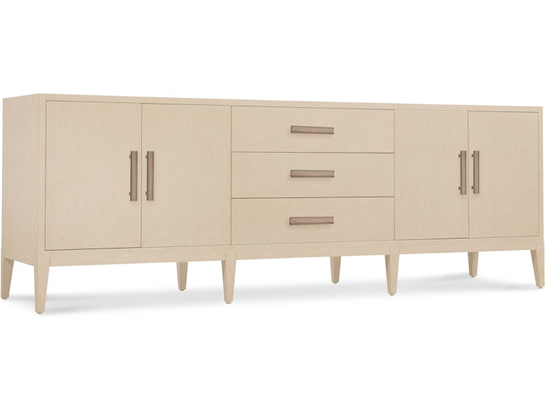 The Westwood Credenza combines sleek modern design with subtle sophistication, making it perfect for living rooms or entertainment spaces. Finished in Polished Limestone over quartered oak veneers, it exudes a soft modern appeal. Featuring four doors with one adjustable shelf behind each pair, three center drawers, and a ventilated back panel with wire management cutouts, this credenza is ideal for holding entertainment systems or providing extra storage. The custom plated Radiance finish hardware and tapered legs complete the look of this elegant yet functional piece. Understated and elegant, the Westwood Collection was designed for those who appreciate the finer things in life. Exuding a “quiet luxury" lifestyle, Westwood seamlessly blends minimalist aesthetics with sophisticated comfort. Crafted with quartered oak veneers, the Polished Limestone finish offers a soft hand, adding character and depth to the group. Plated hardware and silver-leaf detailing adds to the soft modern appeal. Designed for those who value subtle sophistication, the whole home collection with coordinating upholstery can easily transform any space into an elegant haven of serenity and style.