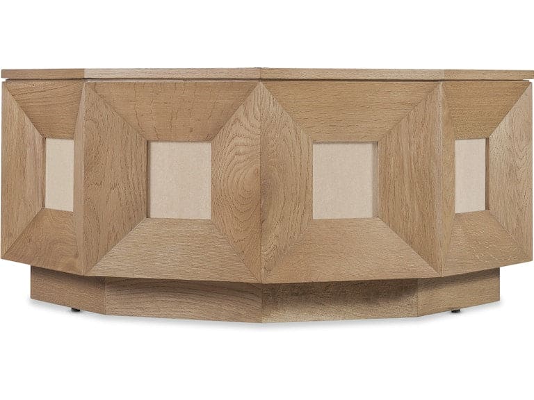The Haven Cocktail Table is a standout piece with a 10-sided, decagon shape and faceted "window pane" design. The medium natural oak finish paired with marble accents on the inset panels creates a sophisticated look, while the plinth base adds stability. Ideal for adding a touch of elegance to a living room, this cocktail table embodies modern luxury with its unique design and fine materials. Targeting the next generation of furniture buyers, Hooker Furniture unveils the Commerce & Market brand of accent and occasional pieces. Interior designers were front-of-mind when the Hooker Furniture team developed the dynamic palette and flexible applications of pieces within the new brand. The assortment of modern and updated designs presented within the brand include a dynamic variety of materials, styles and color palettes to inject a younger sensibility into the company’s portfolio. Commerce & Market consists of pieces for the living room including a variety of accent tables, credenzas, consoles, chests, cabinets, etageres and bar carts. Globally sourced with design inspiration from around the world, the curated designs feature an eclectic assortment of materials including cast metals, bone inlay, marble, stone, travertine, painted glass, acacia solids, pecan, oak, mango wood, and walnut veneers in a variety of rich finishes.