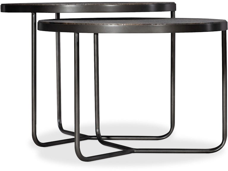 Industrial, chic and modern, this set of 2 bunching cocktail tables has a hammered aluminum top and a carbon steel base in a charcoal gray color. The tabletops are in a black and gray two-tone achieved by an oil and fire technique. The smaller table fits partially under the larger table. Targeting the next generation of furniture buyers, Hooker Furniture unveils the Commerce & Market brand of accent and occasional pieces. Interior designers were front-of-mind when the Hooker Furniture team developed the dynamic palette and flexible applications of pieces within the new brand. The assortment of modern and updated designs presented within the brand include a dynamic variety of materials, styles and color palettes to inject a younger sensibility into the company’s portfolio. Commerce & Market consists of pieces for the living room including a variety of accent tables, credenzas, consoles, chests, cabinets, etageres and bar carts. Globally sourced with design inspiration from around the world, the curated designs feature an eclectic assortment of materials including cast metals, bone inlay, marble, stone, travertine, painted glass, acacia solids, pecan, oak, mango wood, and walnut veneers in a variety of rich finishes.