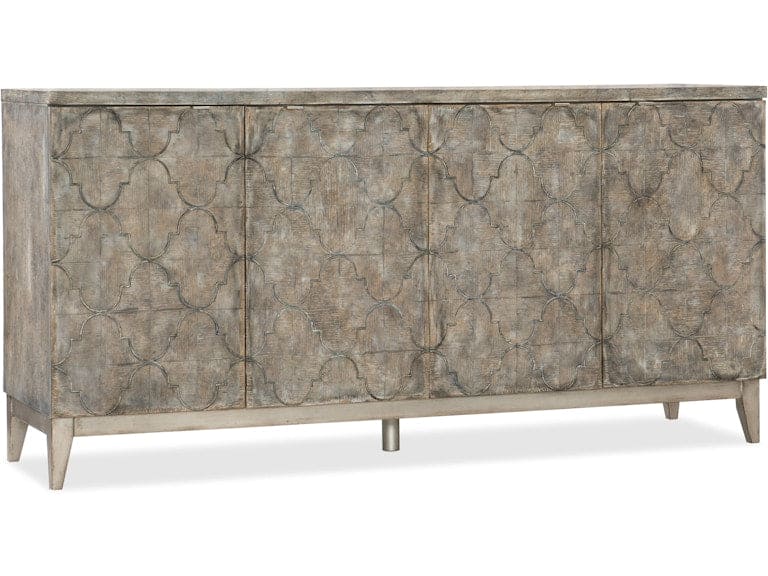 With a delicate and delightful grooved quatrefoil pattern on its doors, the Fairfax Credenza is crafted of Oak Veneers and Aluminum Sheet, accented with silver-colored zinc alloy tab pulls. The wood is in a distressed medium finish with hand planking. Four doors with one adjustable wood shelf behind each set of doors. Ventilated back panel. Come closer to Melange, and you will discover something unexpected, an eclectic blending of colors, textures and materials in a vibrant collection of one-of-a-kind artistic pieces.