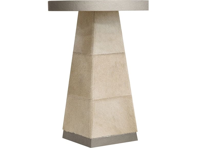 An artistic blend of natural luxury and bold character, the Mélange Holy Cow Spot Table features a honed travertine top, silver metal accents, and a hair-on-hide leather base. Perfect for adding texture and visual interest to transitional spaces. Come closer to Melange, and you will discover something unexpected, something far more than an accent furniture collection offering a multitude of finishes. An eclectic blending of colors, textures and materials in a vibrant collection of one-of-a-kind artistic pieces, Melange is meant to inspire you and fuel an experience of self-discovery. Melange can provide that spark needed to begin the transformation of a room and a renaissance in your life. Each piece of Melange has its own story. The designs are versatile and timeless, easily transcending from one life stage to the next, from home to home and generation to generation.