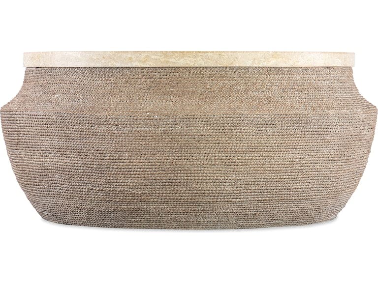 Earthy, organic and chic, the Retreat Round Cocktail Table is rope-wrapped with a Travertine Stone Veneer top. The Travertine Veneer features brown, beige, gray and cream colors, and the rope wrapping is brown. On casters for easy mobility. Retreat is crafted with flat cut cathedral oak veneers and is characterized by two distinct finishes. Each finish is transparent by design to showcase the unique grain patterns of the veneer. Dune is light as sand and smooth as a shore after a receding tide. The second finish, Black Sand was inspired by the black silk sands found on the shorelines of exotic beaches of Maui and Tahiti. Inspired by serene, tropical resort destinations that offer an escape from the pressures of modern life, Retreat is designed to help consumers replicate these peaceful and tranquil environments within their home. The collection can be curated in two distinct personalities: Island Oasis and Modern Zen. Island Oasis intermingles both finishes, creating a tropical retreat-inspired vibe accentuated with organic details such as rope, cane, travertine and woven accents. Highlights include a dramatic pole-cane inspired poster bed, island influenced dining pieces and several upholstered accent pieces using printed and woven textiles and soft sage-toned leather. A few pops of accent finishes called Seagrass and Lagoon can be found on select pieces, enhancing the tropical mood of the collection. Modern Zen delivers a tranquil personality with a contemporary twist that showcases the Dune finish, which is enhanced with accent items in Black Sand. Several pieces incorporate woven cane, dramatic split bamboo-inspired accents as well as Travertine stone. Highlights include a woven cane panel bed with clean modern lines and a variety of case pieces featuring geometric patterns and spa-inspired accents. Upholstered stationary and accent seating – available in sage and caramel tone leathers – complete the Zen narrative. Adding the finishing touch, the collection’s hardware is custom designed to match each personality. Look for reed-inspired designs in Island Oasis and gently textured designs in Modern Zen. Both hardware options are featured in a soft pewter plated finish.