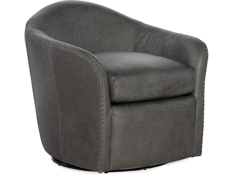 Offered in a fun barrel-like silhouette with a low back and sloped arms, the Roper Swivel Club chair is covered in the Big Top Blue Steel semi-aniline top grain leather with intricate baseball stitched trim detail. Tight back and loose seat cushion. Hooker Furniture Upholstery is a designer-inspired collection of upscale leather seating that includes versatile reclining chairs, modern-day reclining sofas, eclectic club and artisan accent chairs, as well as a selection of executive desk chairs for the home. Designed and curated to appeal to a variety of style tastes, each piece from Hooker Furniture Upholstery is meticulously crafted in a unique selection of textures and hues.