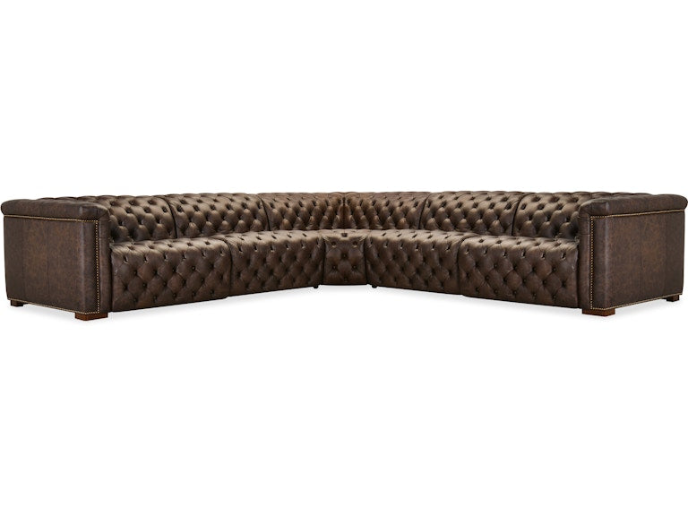 The Savion Deux 5 Seat Sectional with three power recliners and six power headrests is upholstered in luxurious West Saddlewood Top Grain leather. This sectional features classic chesterfield tufting, copper-toned nail trim, and dark wood accents for a seamless blend of sophistication and comfort. With power reclining seats at each end and one armless seat, it’s the perfect centerpiece for a large living room. Hooker Furniture Upholstery is a designer-inspired collection of upscale leather seating that includes versatile reclining chairs, modern-day reclining sofas, eclectic club and artisan accent chairs, as well as a selection of executive desk chairs for the home. Designed and curated to appeal to a variety of style tastes, each piece from Hooker Furniture Upholstery is meticulously crafted in a unique selection of textures and hues.