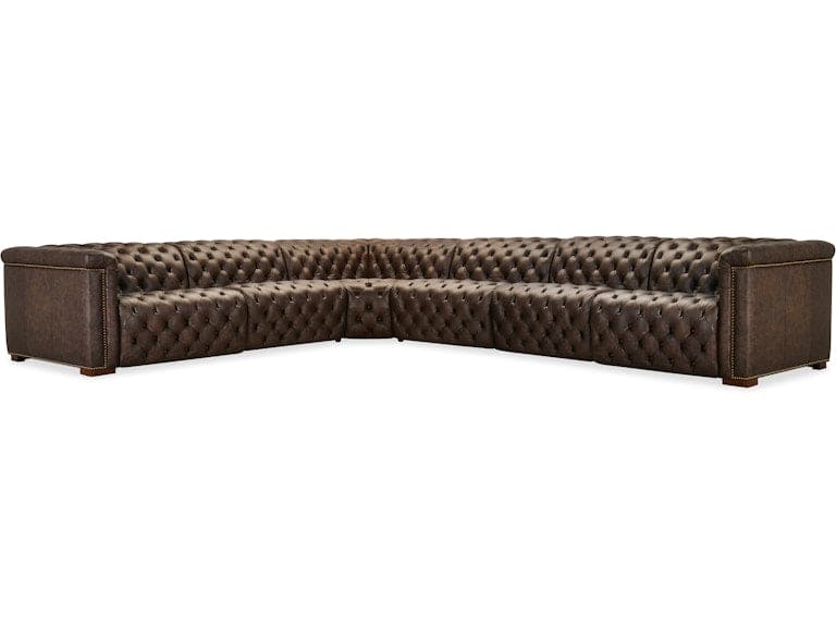 This Savion Deux 6 Seat Sectional, upholstered in rich West Saddlewood leather, offers four power recliners and seven power headrests. With classic chesterfield tufting, copper-toned nail trim, and dark wood accents, this sectional is the epitome of luxurious seating. The discreetly concealed power reclining function ensures comfort without sacrificing style, making it ideal for larger, sophisticated living spaces. Hooker Furniture Upholstery is a designer-inspired collection of upscale leather seating that includes versatile reclining chairs, modern-day reclining sofas, eclectic club and artisan accent chairs, as well as a selection of executive desk chairs for the home. Designed and curated to appeal to a variety of style tastes, each piece from Hooker Furniture Upholstery is meticulously crafted in a unique selection of textures and hues.