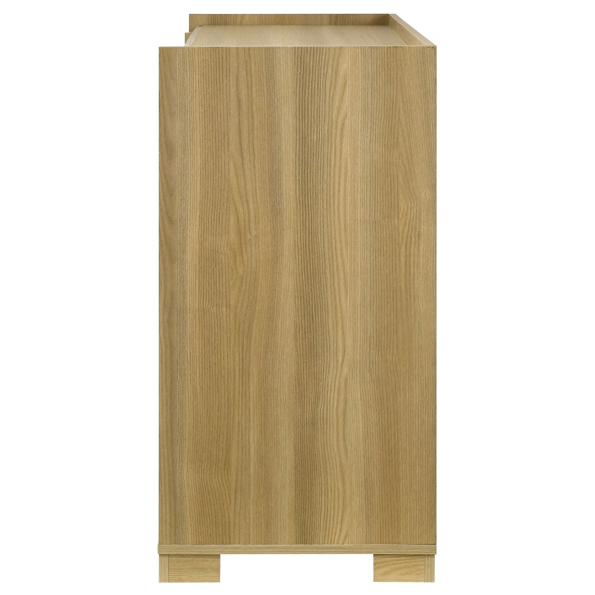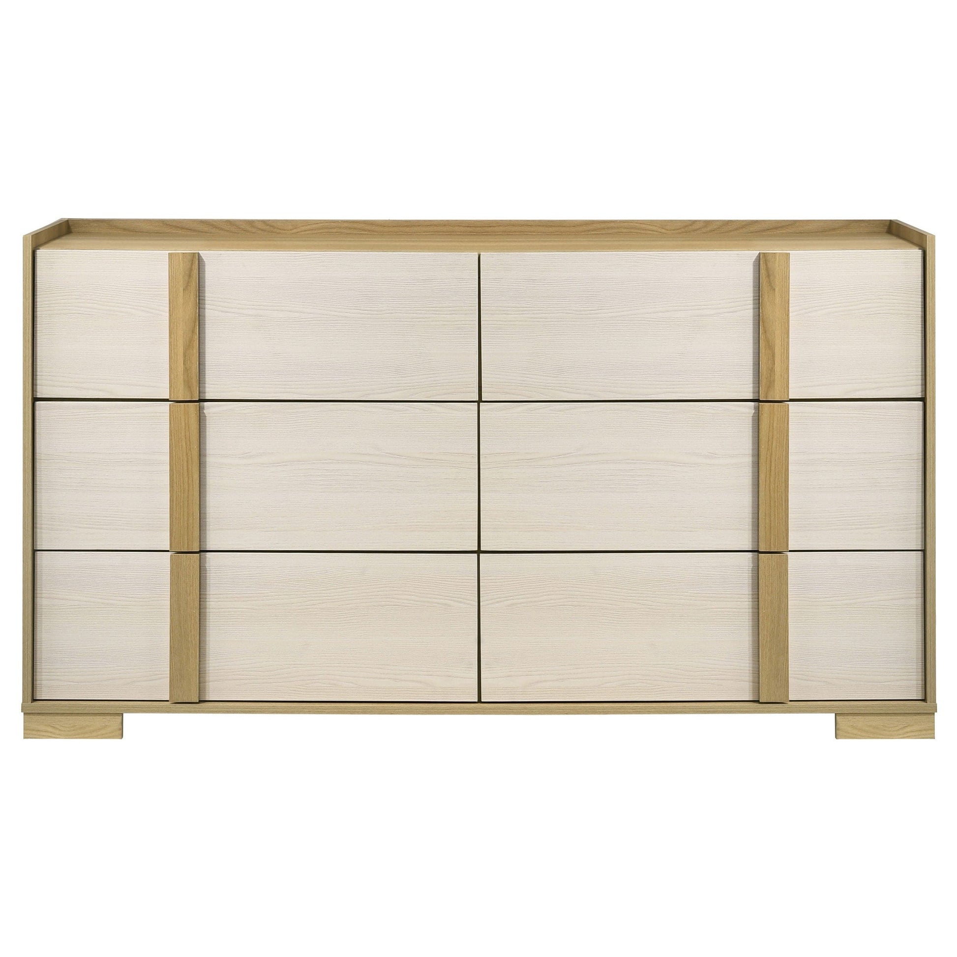 Enhance your bedroom with the contemporary elegance of this six-drawer dresser. Inspired by modern Italian design, it features a sophisticated blend of natural wood tones and white panels crafted from durable, easy-care melamine. The drawers, equipped with metal extension glides and pin-construction joinery, offer smooth operation and ample storage for your clothing and accessories. The vertical lines of the natural finish hardware add a touch of sleek sophistication, perfectly complementing the dresser's clean lines and modern aesthetic. This dresser is not just a storage solution but a stylish focal point that elevates your home decor.