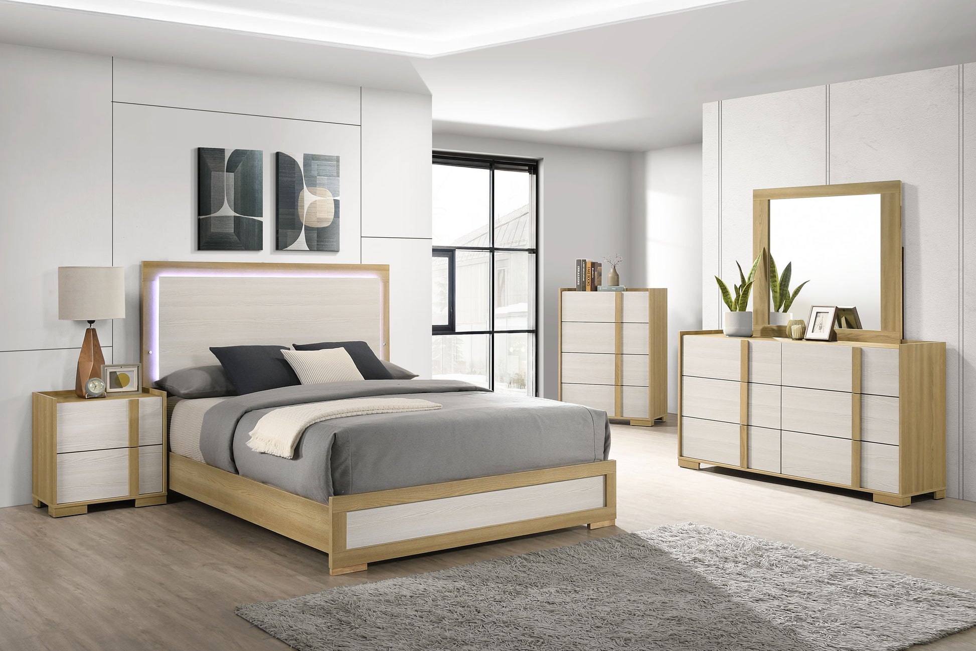 Enhance your bedroom with the contemporary elegance of this six-drawer dresser. Inspired by modern Italian design, it features a sophisticated blend of natural wood tones and crisp white panels crafted from durable, easy-care melamine. The drawers, equipped with metal extension glides and pin-construction joinery, offer smooth operation and ample storage for your clothing and accessories. The vertical lines of the natural finish hardware add a touch of sleek sophistication, perfectly complementing the dresser's clean lines and modern aesthetic. This dresser is not just a storage solution but a stylish focal point that elevates your home decor.