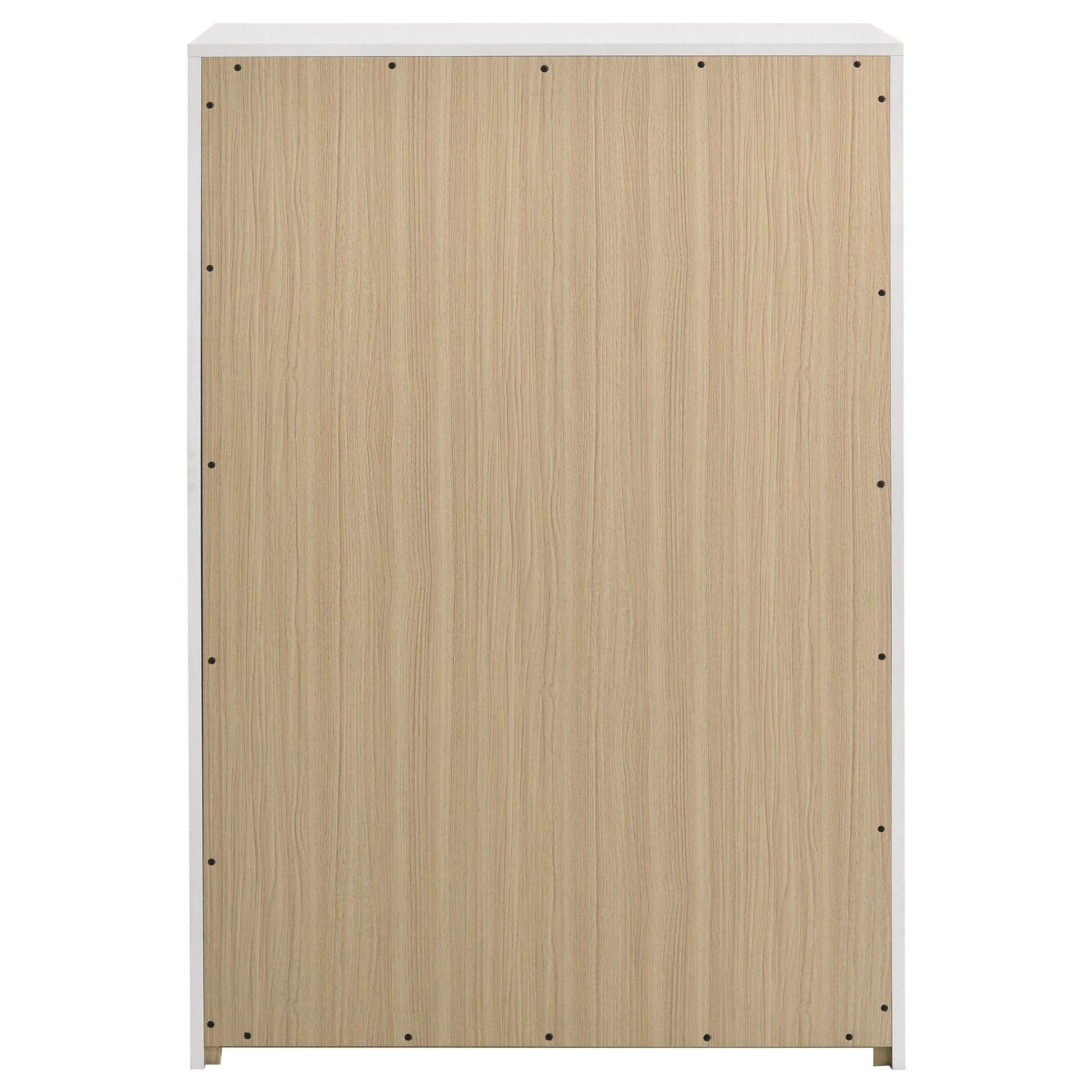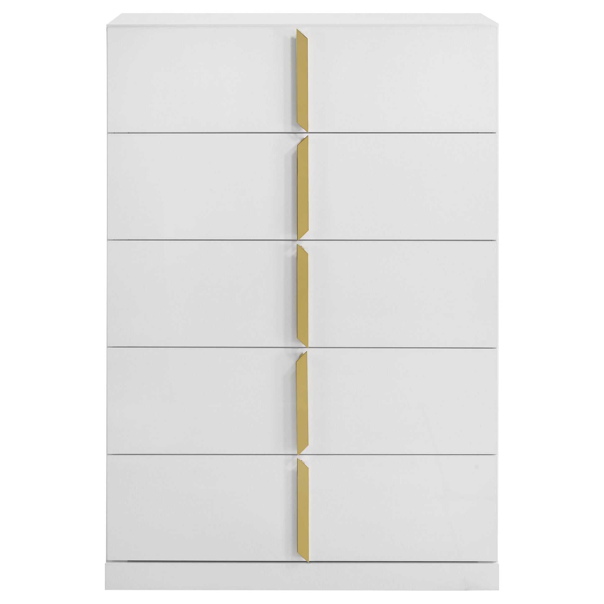Inspired by Italian contemporary design, this five-drawer chest of drawers blends sculptural elegance with lasting performance. The white high gloss finish is laminated in PET, a high-performance thermoplastic known for its scratch resistance, moisture resistance, and long-term durability. Vertically mounted polished gold pulls add a bold accent, while five spacious drawers provide stylish storage for the modern bedroom.